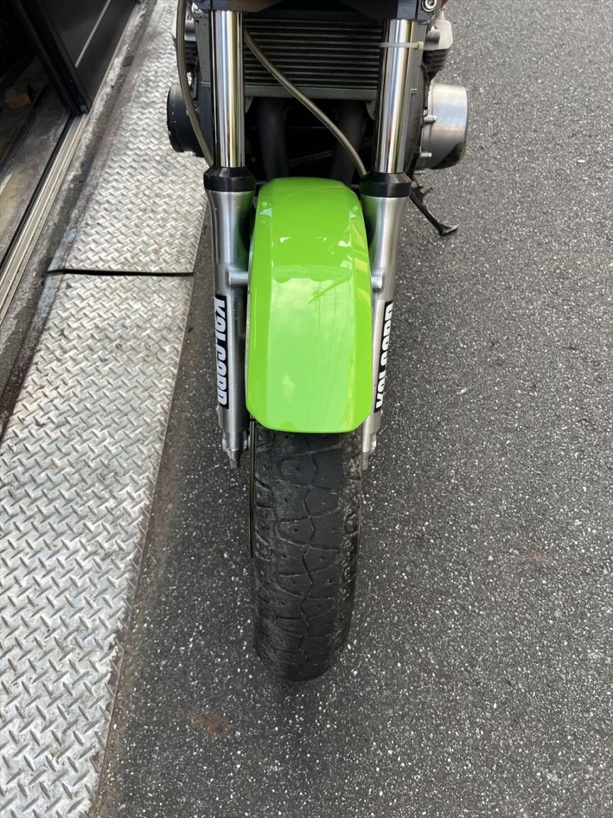 フォークは目視でよく見ると僅かにねじれたようです。このくらいなら走行には全く問題無いでしょう。