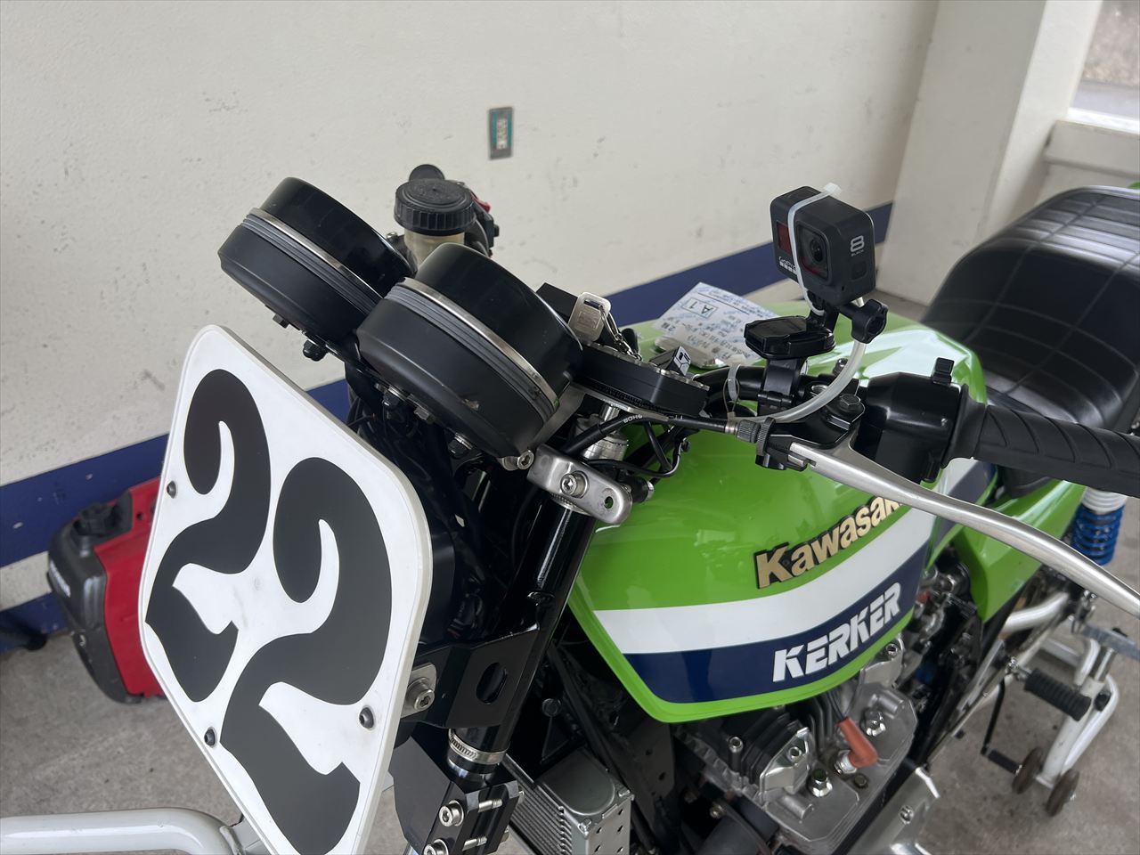 ある方からあまり使用していないというカメラを数台提供いただいたので、2台それぞれに車載カメラを装備できるようになりました。#21のこちらは自前のDJIアクションカメラ最新版、OSMO ACTION 5 PRO。フロントにセットします。メーターを画角に入れ込むと情報量が多い映像になるのですが、ライダーの伏せ姿勢に支障があったり、メーターがカメラの視界を一部さえぎったりするので、カメラポジションとレンズの広角度合いの調整など、それなりにテストが必要になるのです。