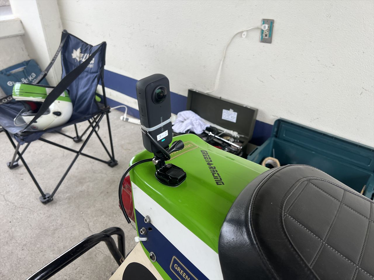 リヤはちょっと古いInsta360 X3をテールカウル上にセット。こちらは360°映像を撮るのでカメラの向きなどはあまり気にしないでも全て撮れるので大丈夫です。フロントもこの360°カメラを付ければいいのではと思いますが、この縦長形状がゆえにマウントが難しいという欠点があります。それぞれカメラは脱落してもコースに落とさないよう、「命綱」を付けてあります。