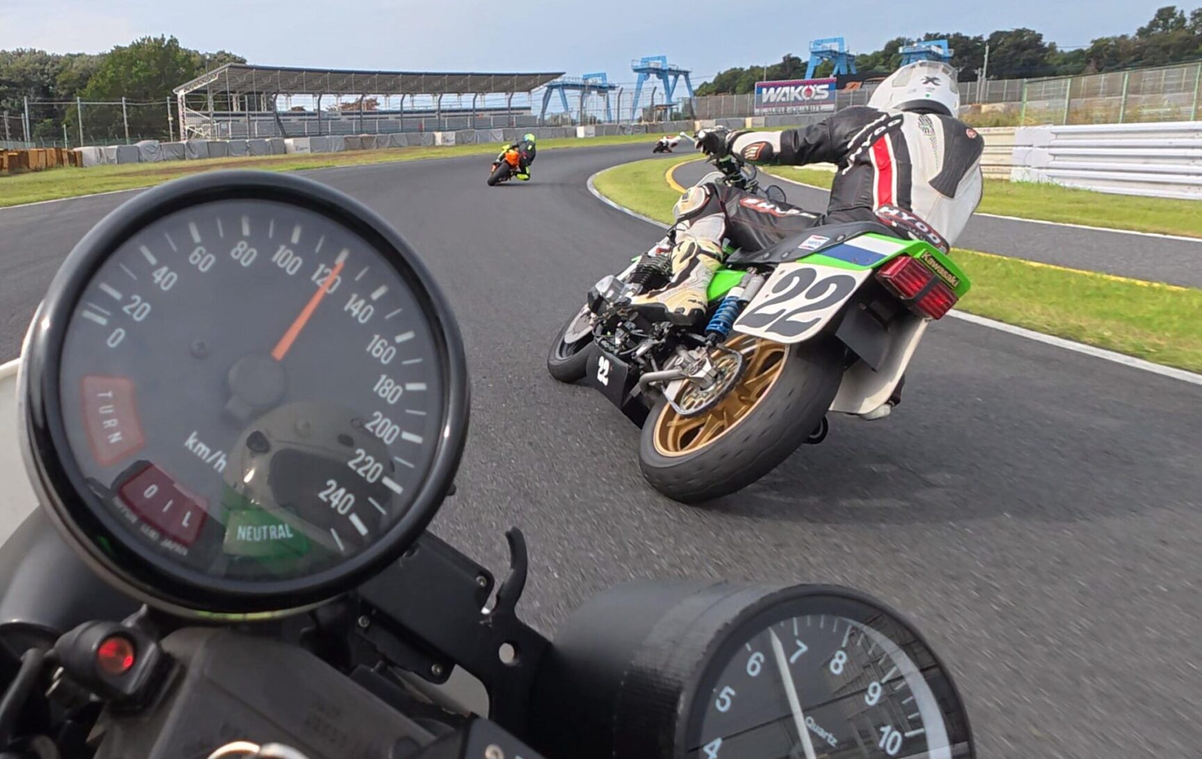 この日の走行は2本。#22番さんも前回の転倒の影響は無いようで、徐々にタイムを上げてきました。タイムが上がるにつれ、ライン取りに無駄が見られず、フォームも改善してきたので後ろから見てカッコいい感じになってきましたね。
