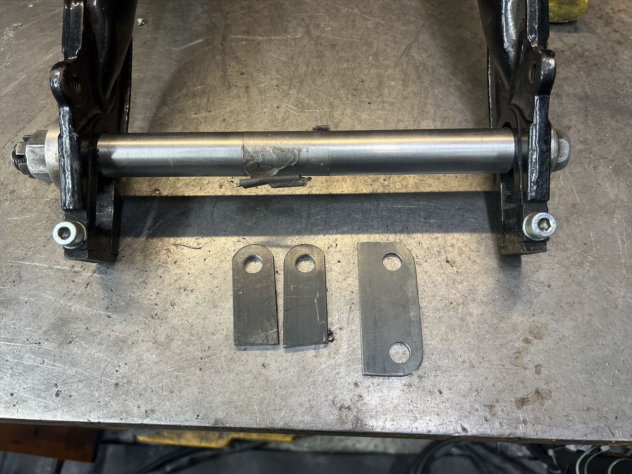 ワークススイングアーム製作の続きです。メインのトラスパイプが付いたので、左右の補強パイプを追加します。