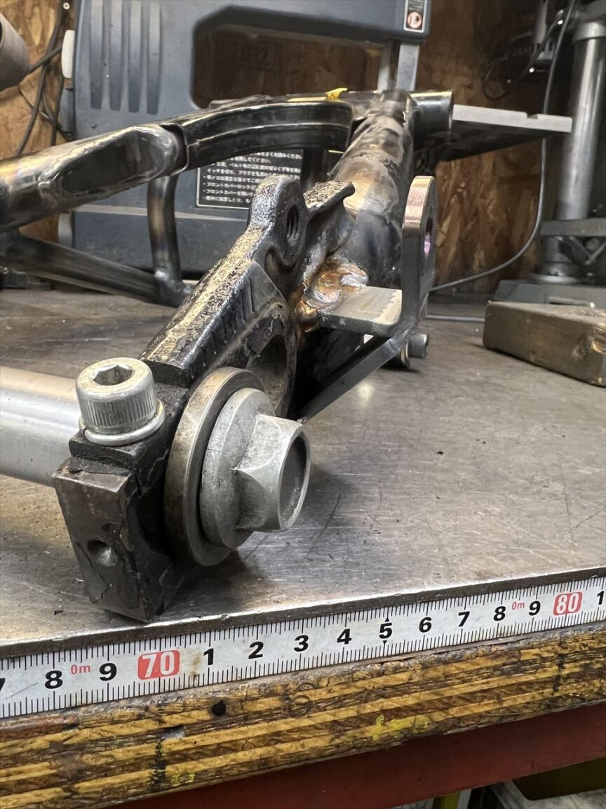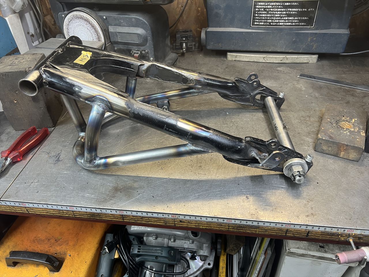 現物に合わせてパイプ断面をすり合わせしてから溶接します。左の縦パイプが大きく湾曲しているのはチェーンとの干渉をクリアするためです。