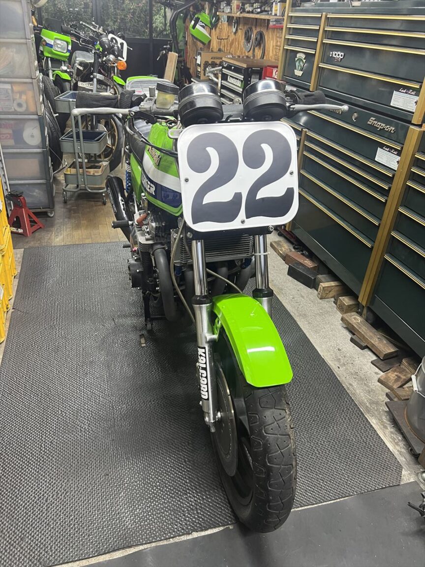 ゼッケン文字をカッティングマシーンで製作し貼付け。私の21番と元は同じデータですが、21の2を横に2つ並べるとプレート幅が足りなくなるので、微妙に数字の横幅は狭くしてあります。元のこのAMAでよく使われていた書体は、当時の写真を見ながら私がフリーハンドで起こしたもので、フォントには無いものです。当時のゼッケン数字も基本は手書きだったようです。