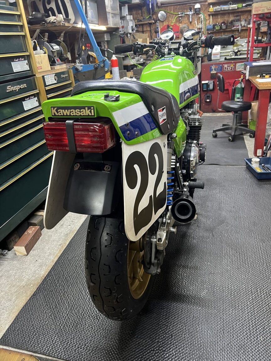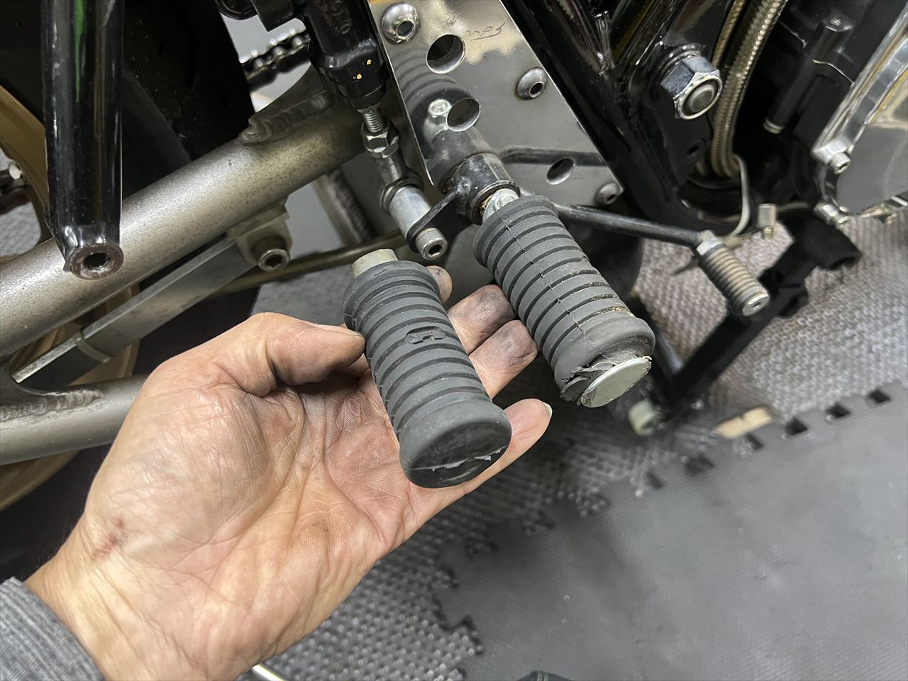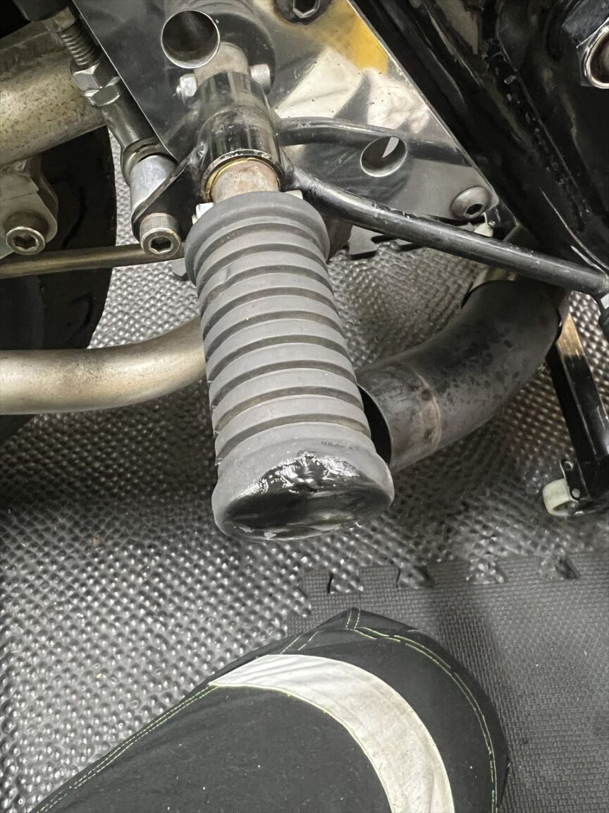この弊社製ワークスステップのステップペグはZ2の純正タンデムステップなのですが、最近まで純正品が買えましたが現在は廃盤となってしまいました。オーナーさんがスペアで持っていたペグに交換します。ちなみに代替の現行品は、ペグのエンドがオープンなデザインです。
