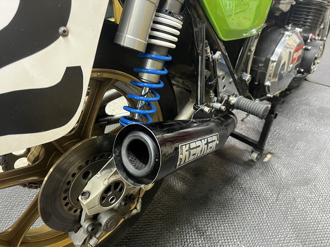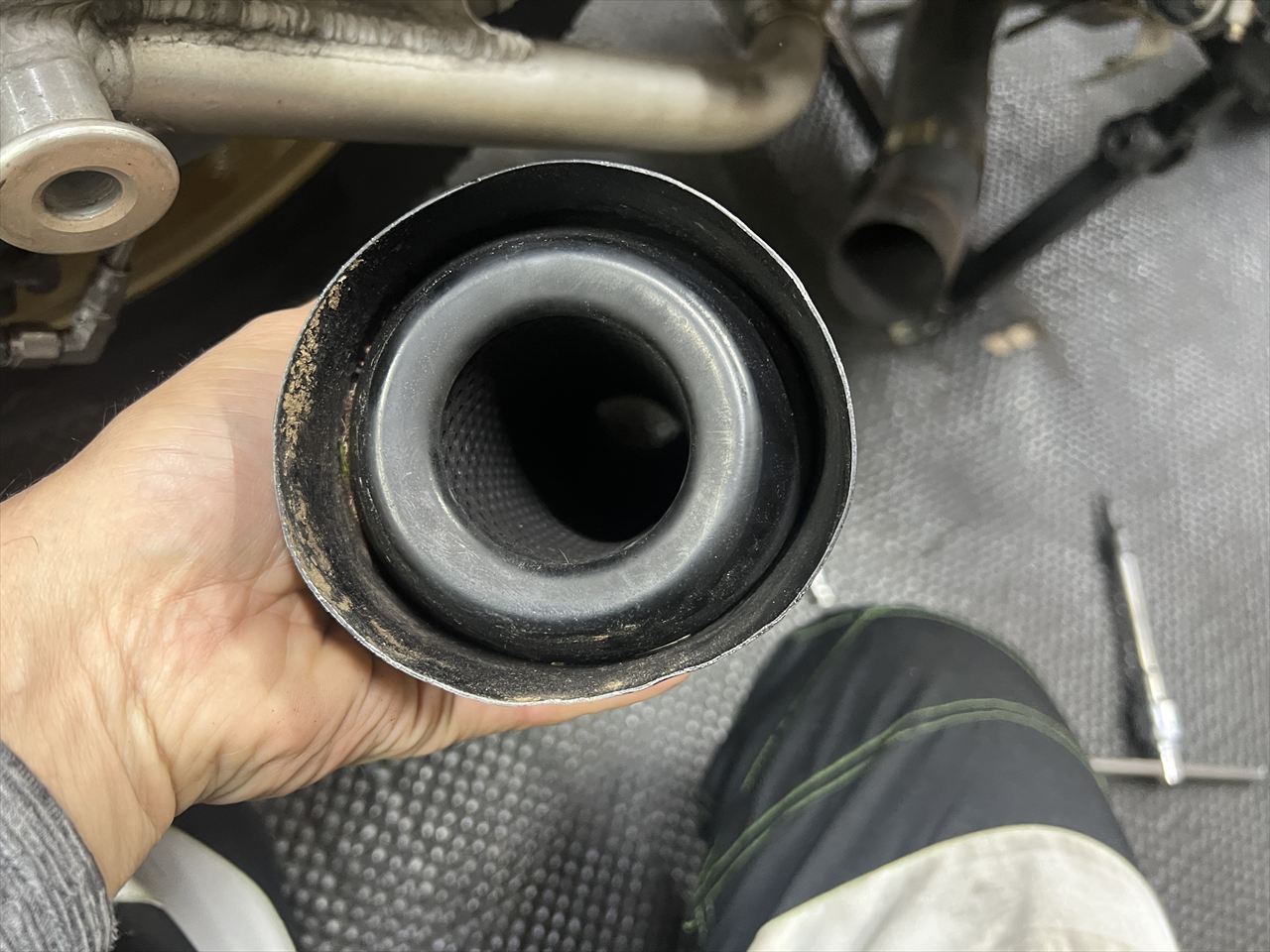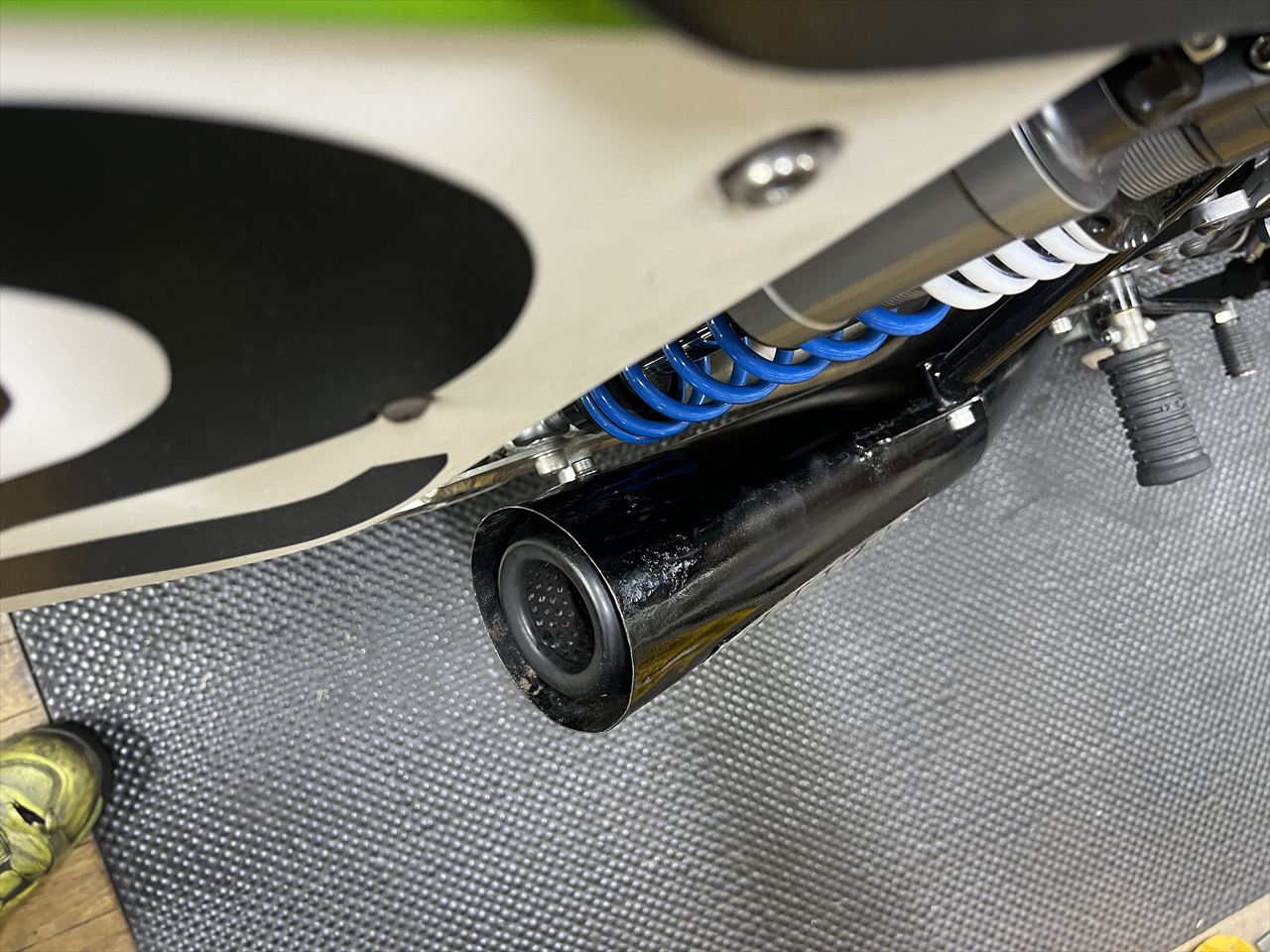 この弊社製ワークスステップのステップペグはZ2の純正タンデムステップなのですが、最近まで純正品が買えましたが現在は廃盤となってしまいました。オーナーさんがスペアで持っていたペグに交換します。ちなみに代替の現行品は、ペグのエンドがオープンなデザインです。