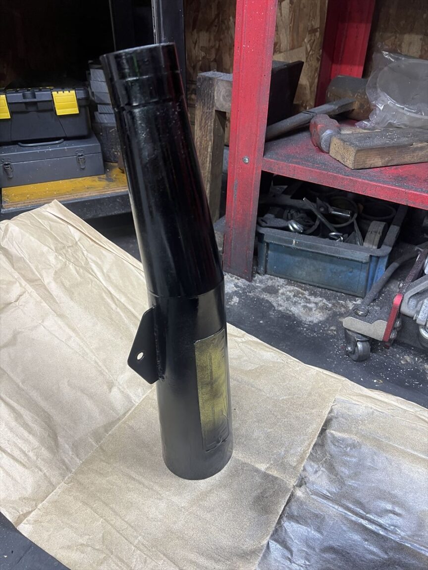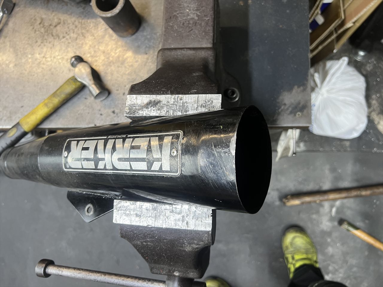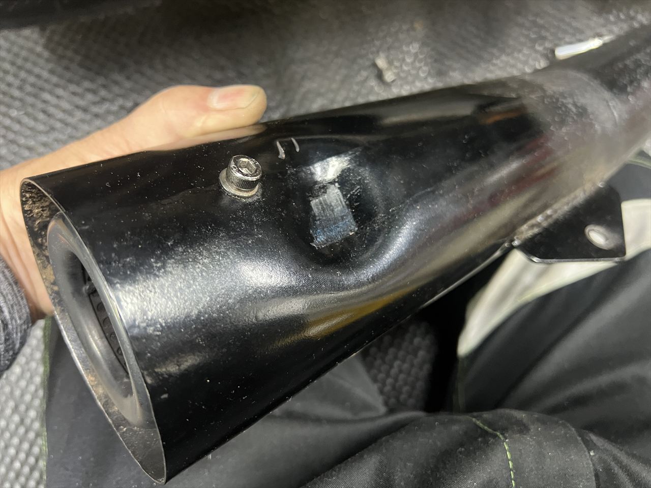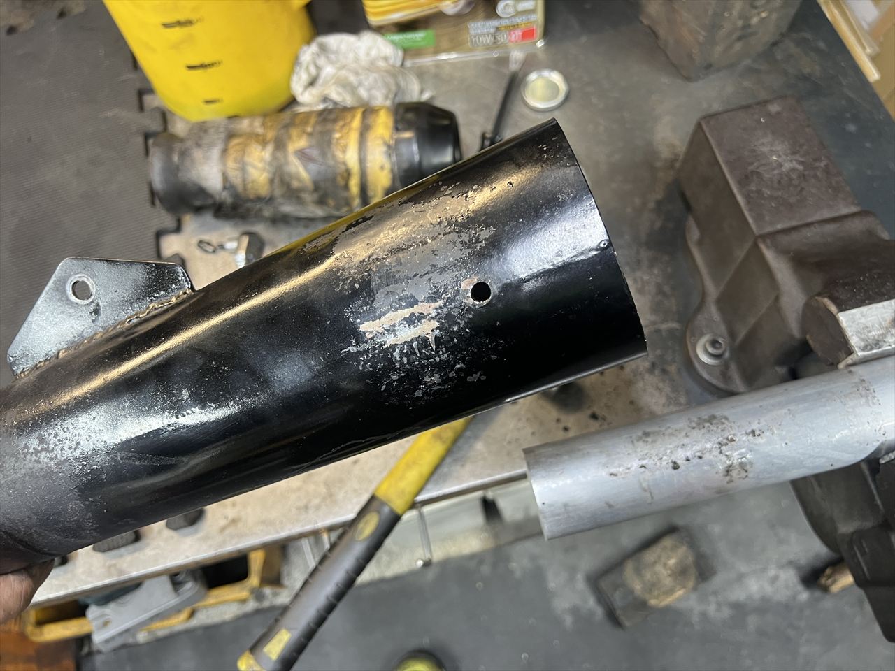 続いてサイレンサーを修理します。スチール製なのでこのくらいは復元可能でしょう。この凹みはリヤショックのスプリングに押し当てられて凹んだものです。