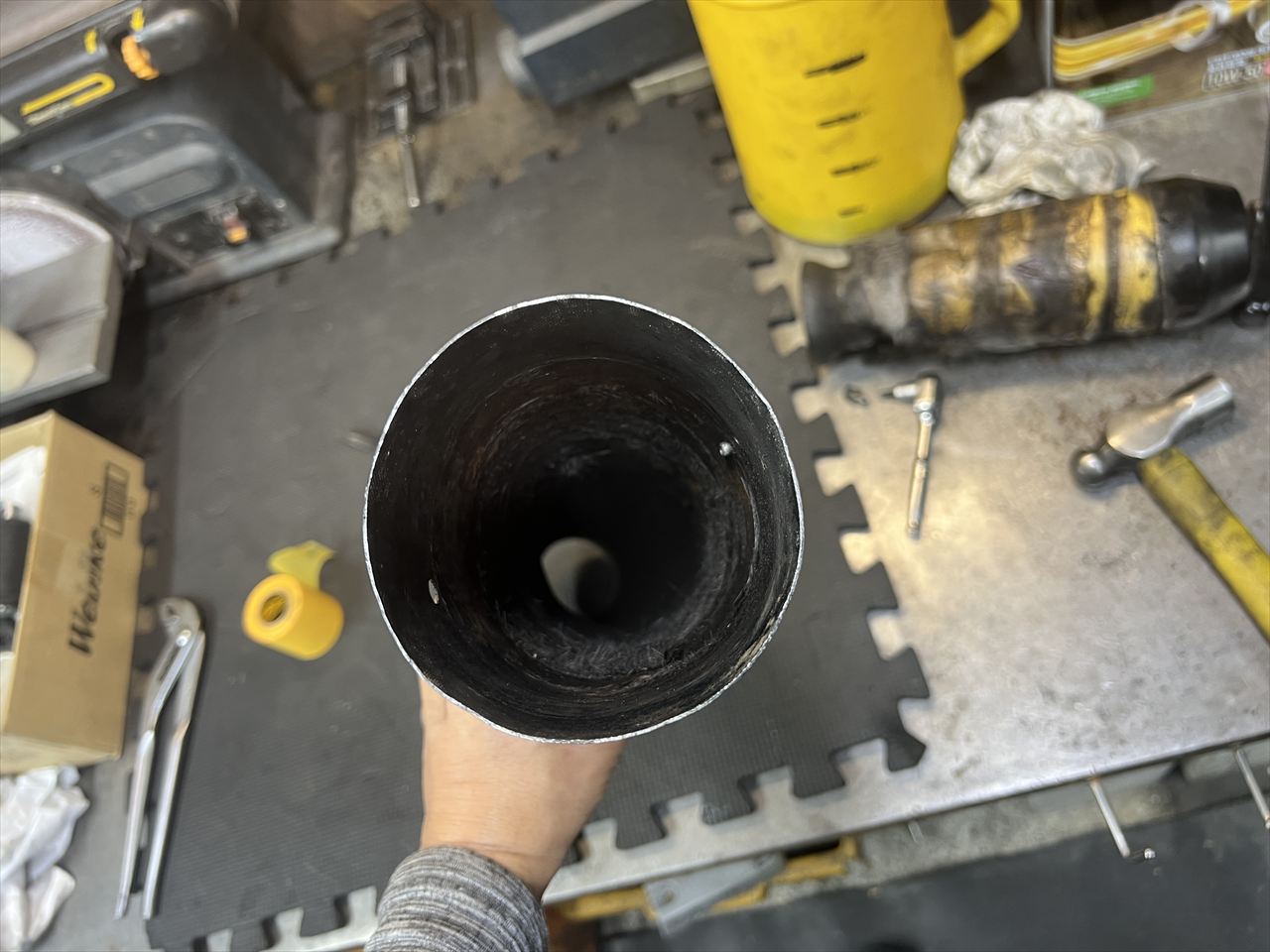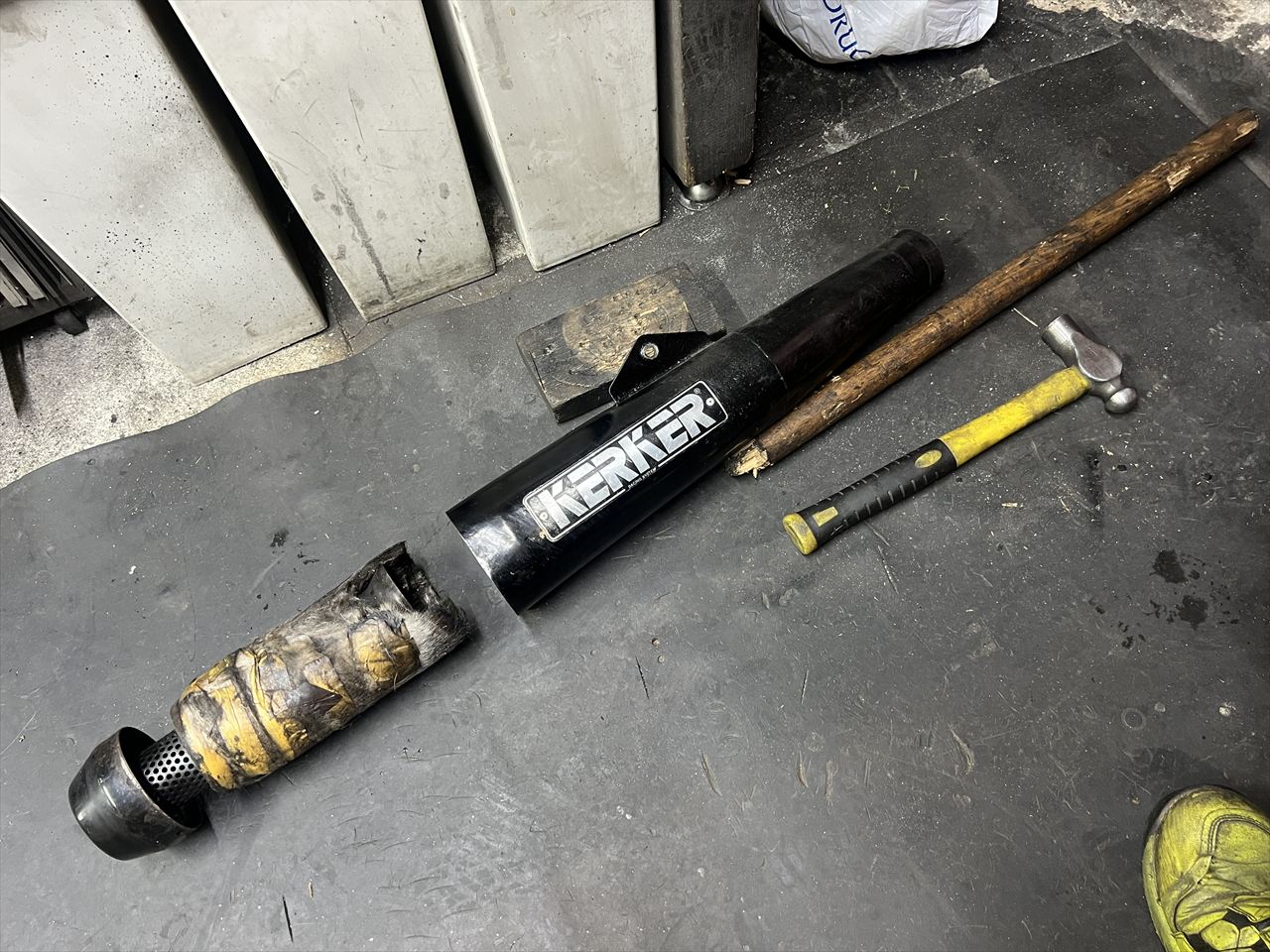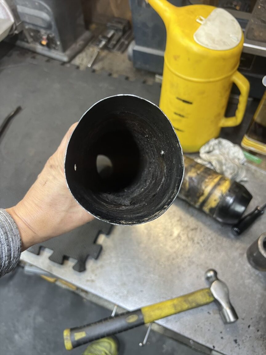 凹みを直します。丸い棒に差し込みハンマーで叩きます。