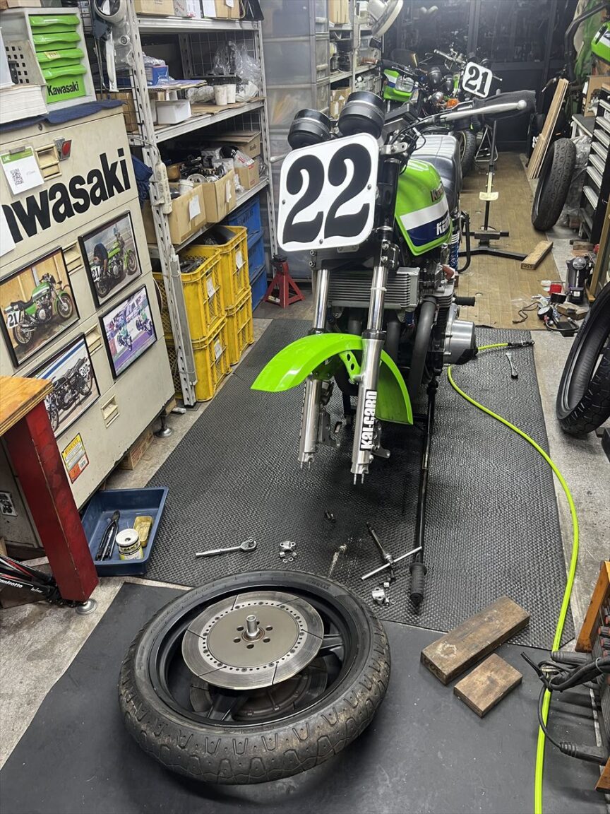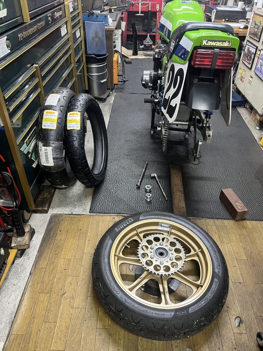 続いて前後のタイヤ交換です。まだ山は残っていますが、用意しておいた新品のピレリに交換します。レースには最善の状態で臨みたいものです。