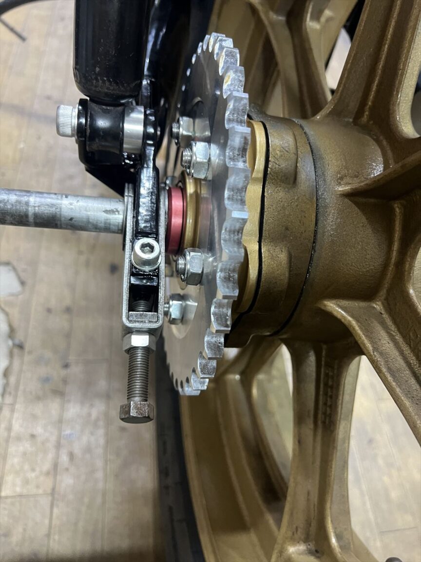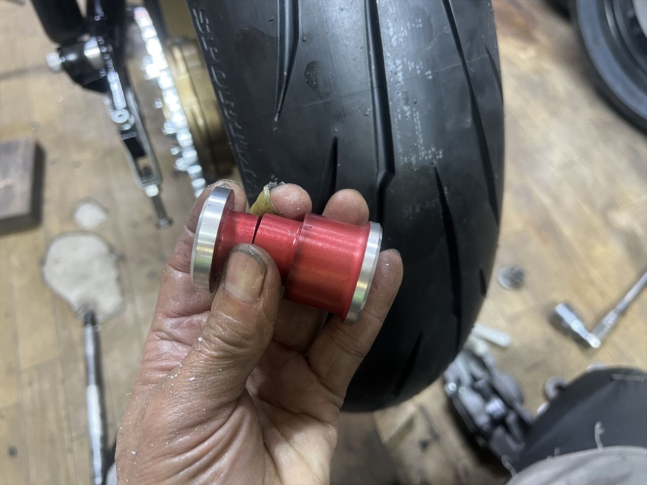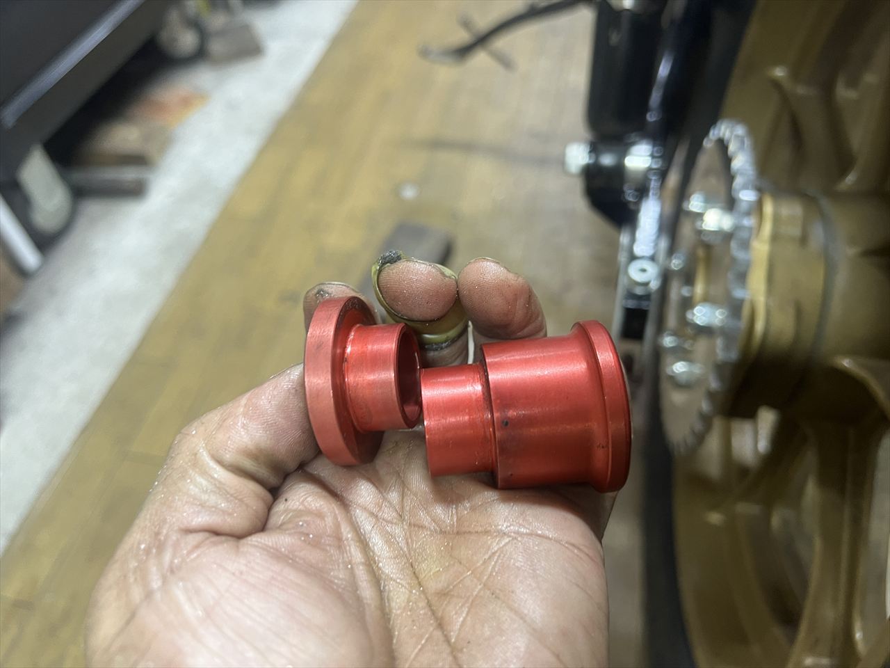 続いてリヤ周りへ。ホイール側のカラーは既存のモーリスの物が寸法的に合うのでそのまま使用します。しかし、赤い色が目立ってしまいます。
