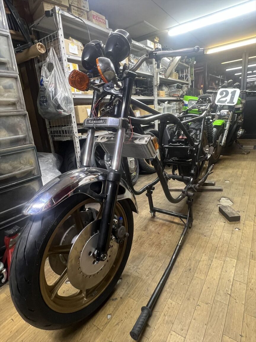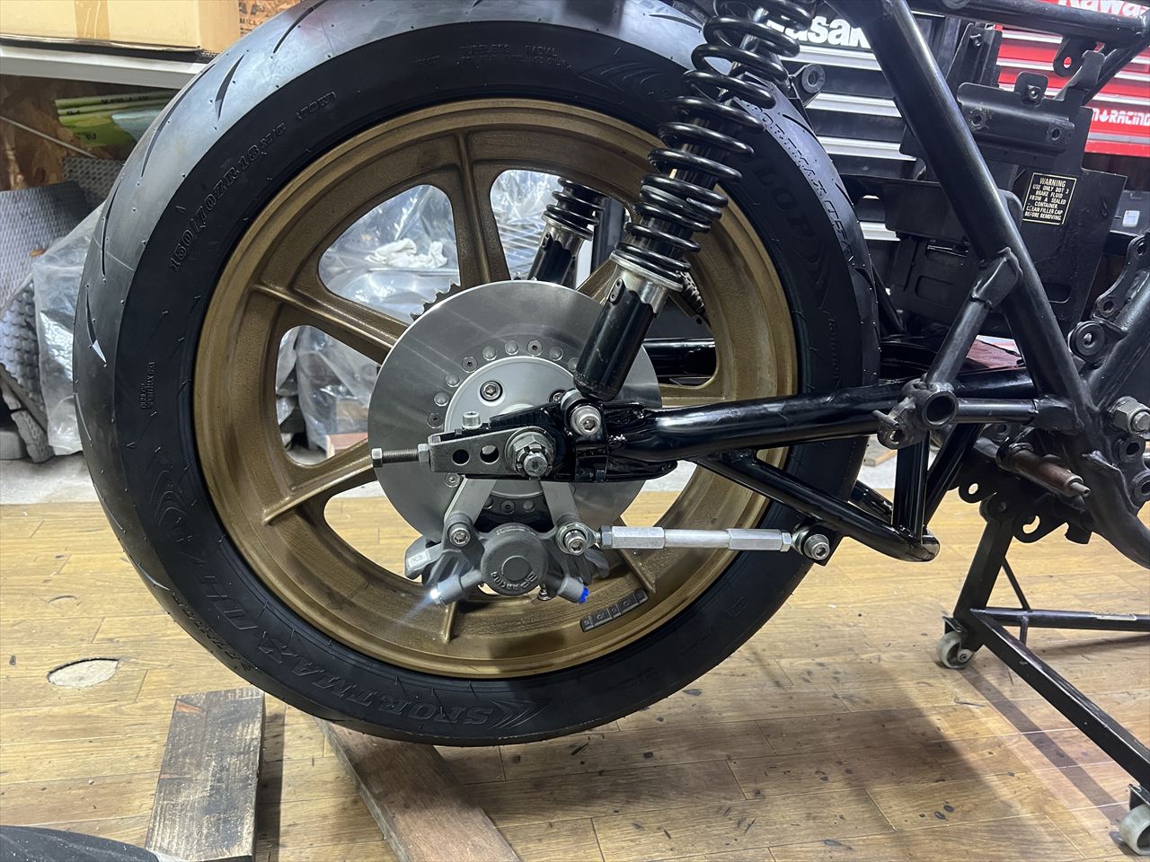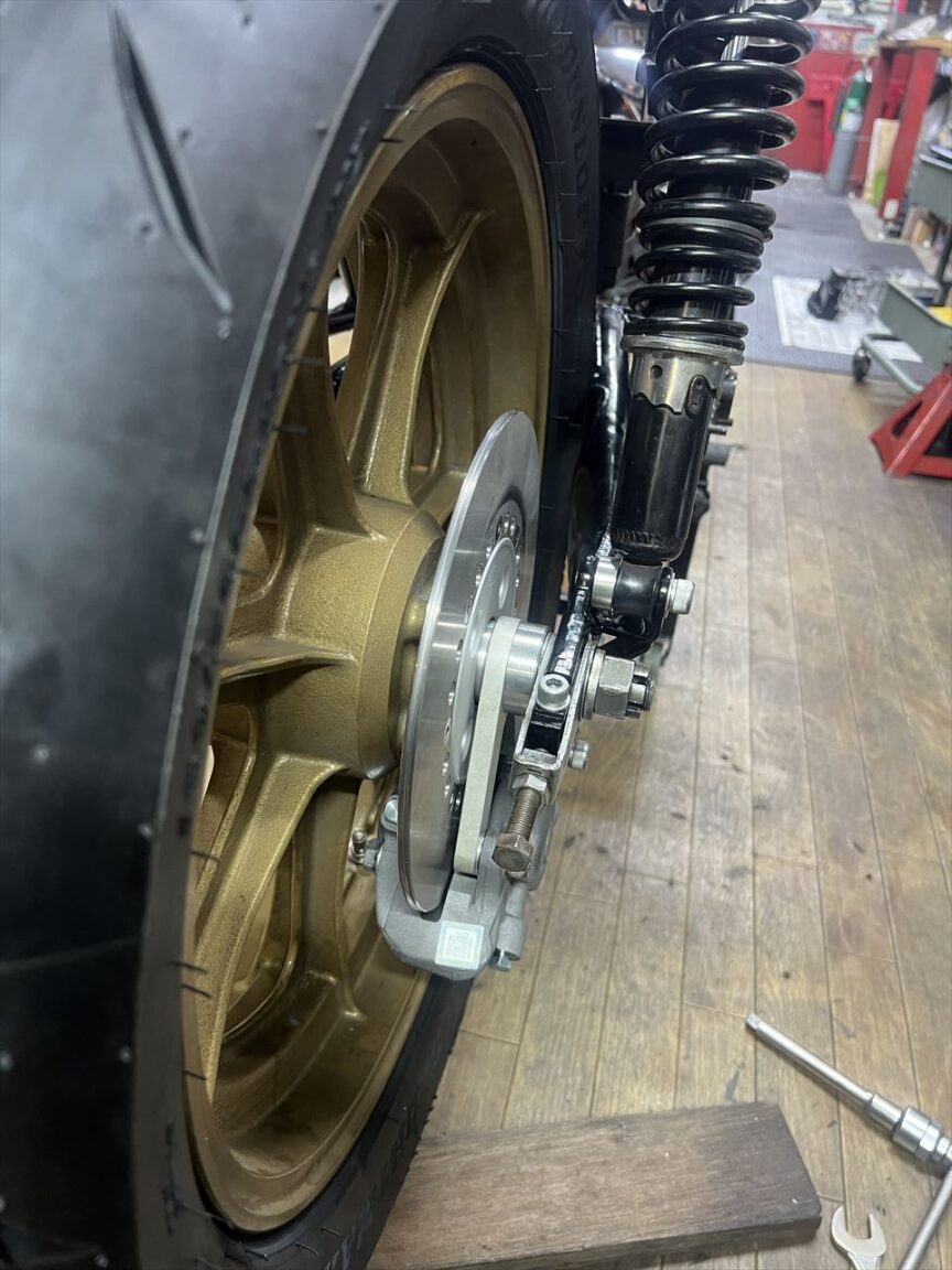 サポートとキャリパーを仮付けしてみます。AMAカワサキワークスMk2の雰囲気が出たでしょうか。