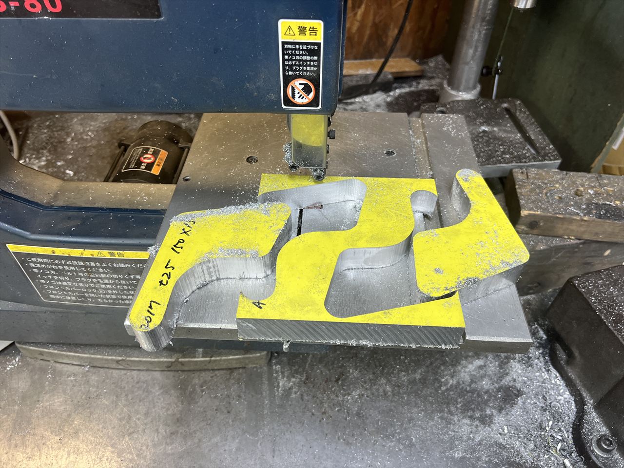 初めにバンドソーで切り抜きます。小型のバンドソーなので進みが遅く、2個切り出すのに1時間ほどかかります。
