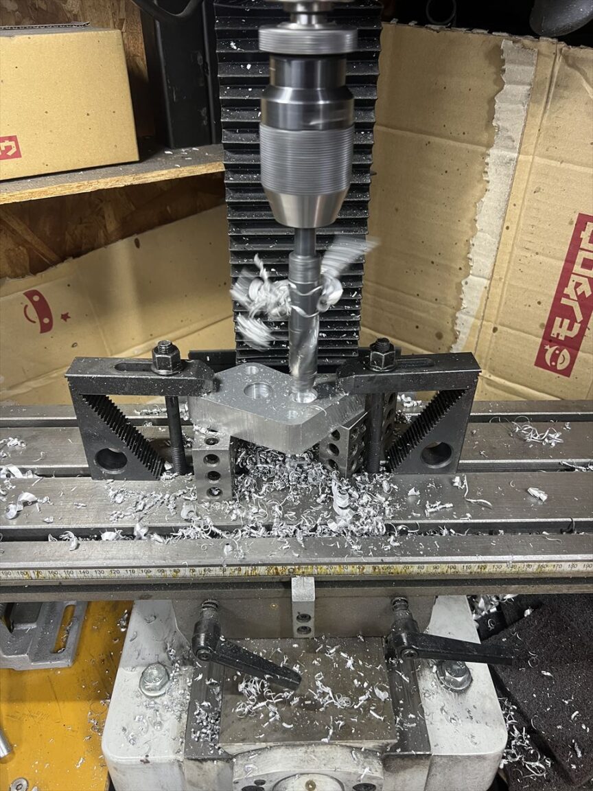 基本的に手作業で作るので、先ずは素材のアルミ板にテンプレートから形を写します。素材はジュラルミンの25ミリ厚のプレートです。真ん中は市販S1と同じプレートタイプの素材です。素材は7N01の7ミリ厚プレートです。こちらもこのあと作ります。ちなみにS1実車はZ1000Jタイプのフォークなので、カヤバフォーク用のサポートは当時存在しませんでした。なので、意匠を引き継いだ形であらたにデザインしたもので、少し細長くなるのが特徴です。真ん中のサポートはZ1000Jフォーク用、左はカヤバ用、それぞれ微妙に形が違います。