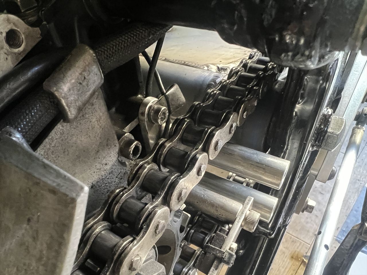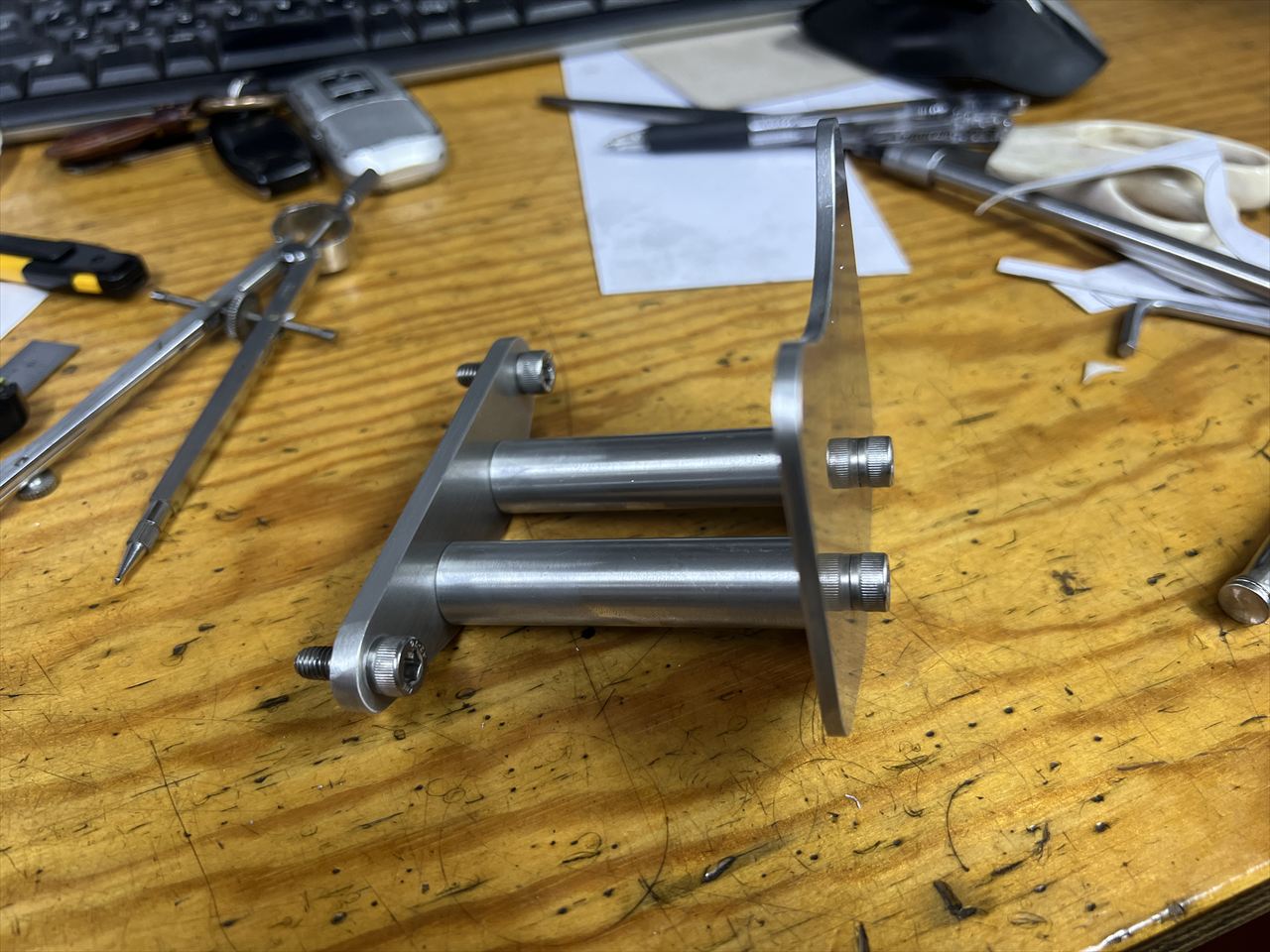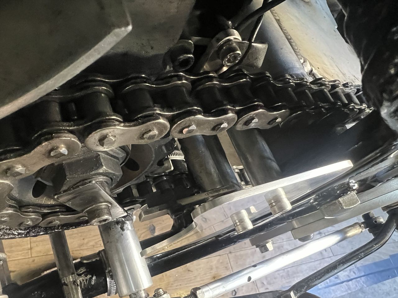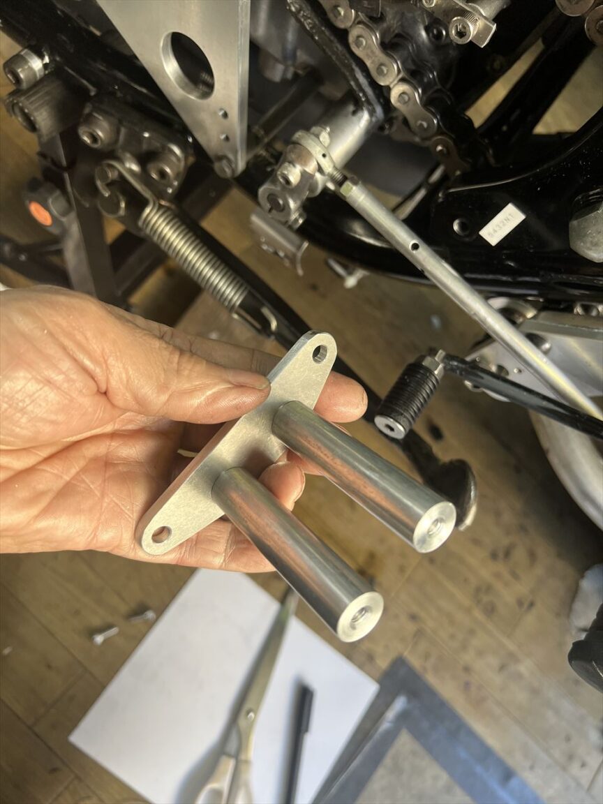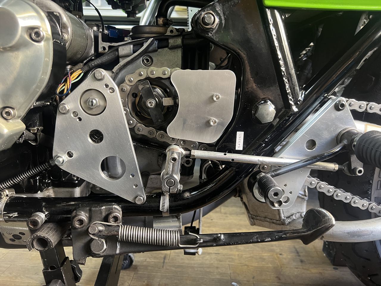 フロントスプロケ周りはワークスS1をモチーフに製作してあるので、外部からフロントスプロケが見える仕様になっています。リヤスプロケの手前はレギュレーションでガードを付けることが義務付けられていますが、フロントスプロケに対しては特に規定がありません。ですが車検の際にガードを付けるように指示されたとのことで、今回製作します。私のレーサーと同じ仕様なので、私の車両を使って形状を検討します。ボルトオンで付けたいので、ガードのベースはこんな形にしました。