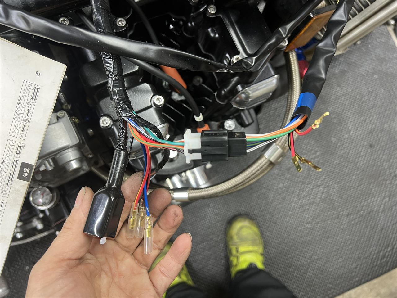 左右のハンドルスイッチカプラー周りも大きく改造します。基本的にメインハーネス側は加工せず、周辺ユニット側の配線加工で対応します。