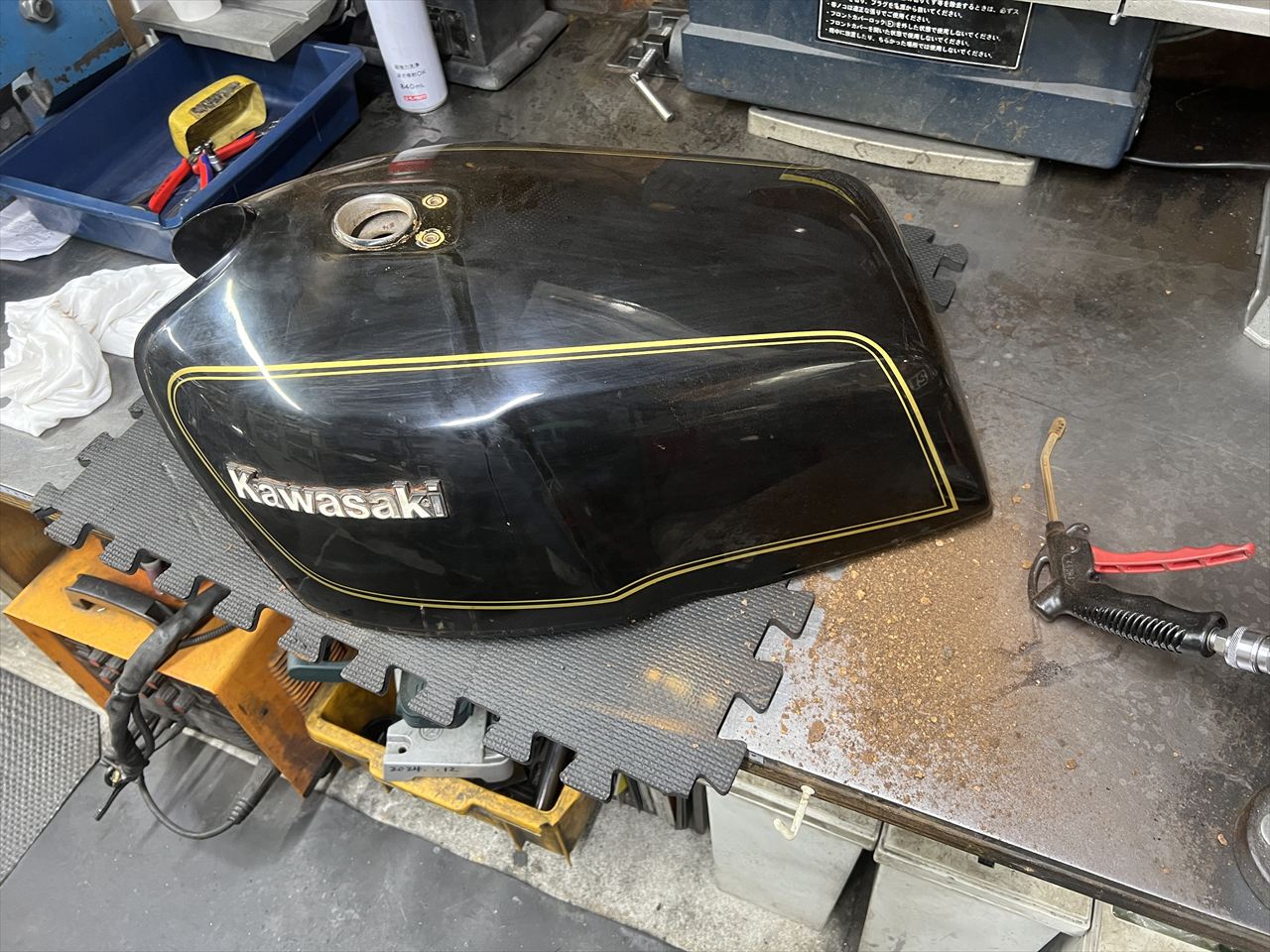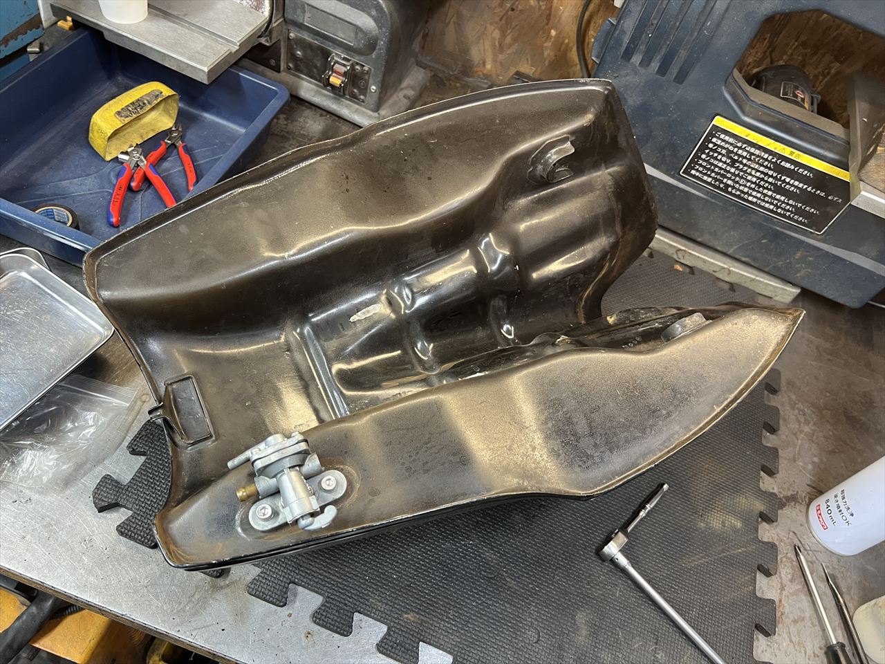 最後にタンクの整備。サビ取り剤で大量のサビが出てきたタンクは、一旦乾燥して保管していました。車体が完成してタンクを準備しようとみてみると、また内部にサビが溜まっていました。内壁から剥離してくるのでしょうか。あまりサビ取り剤を強く使うとサビの深い所から穴が開いて漏れてくることがあります。とりあえずこのまま使えるか様子を見てみます。