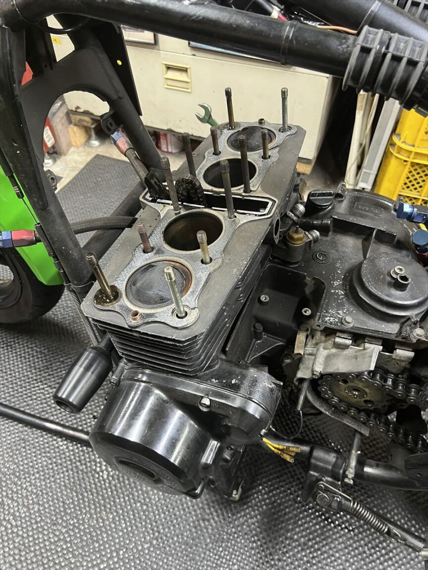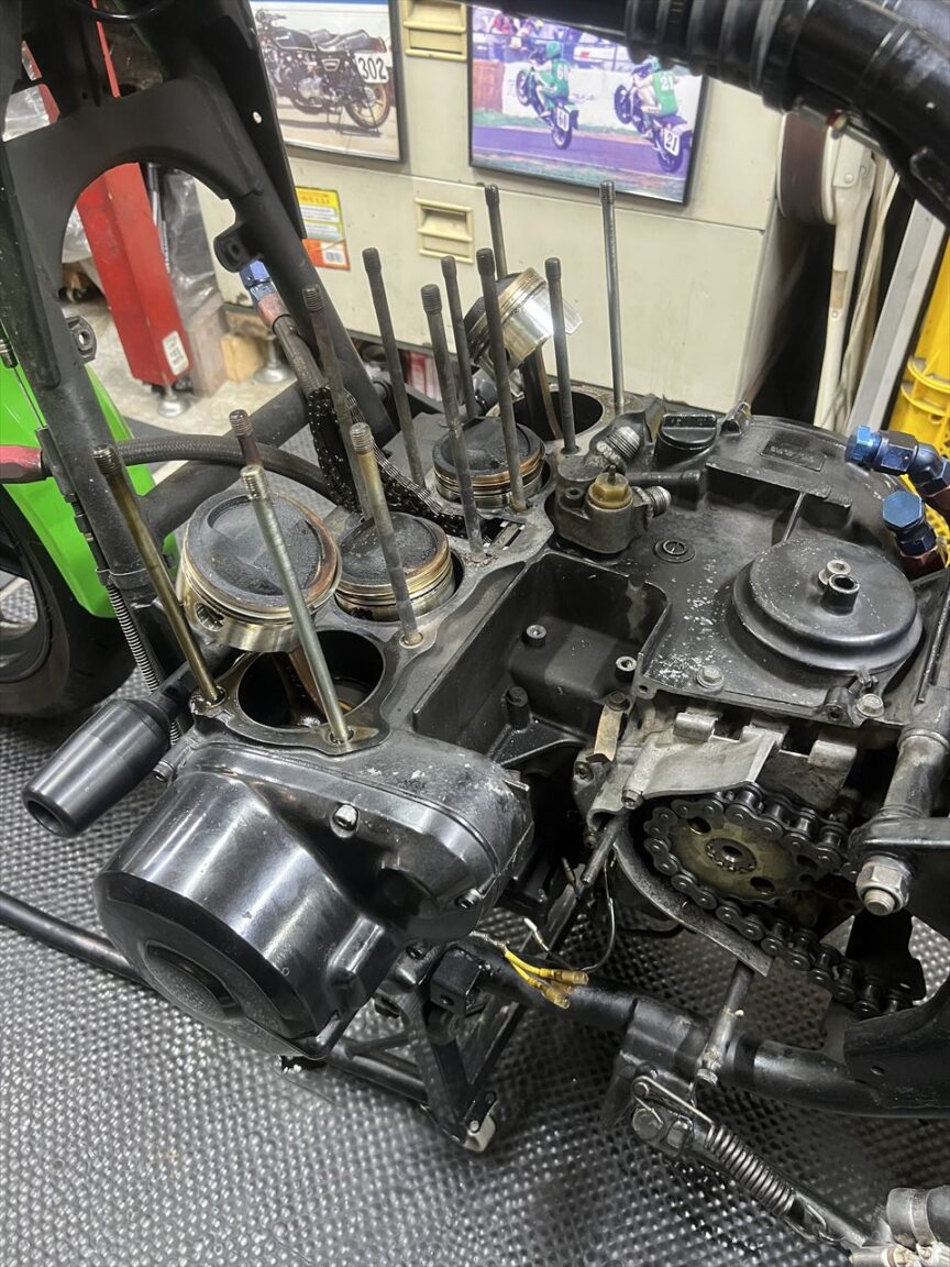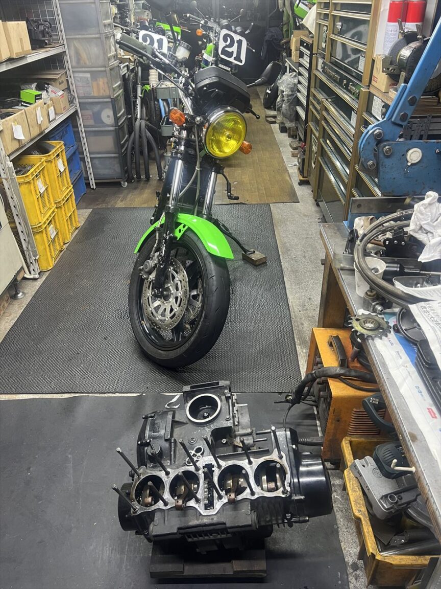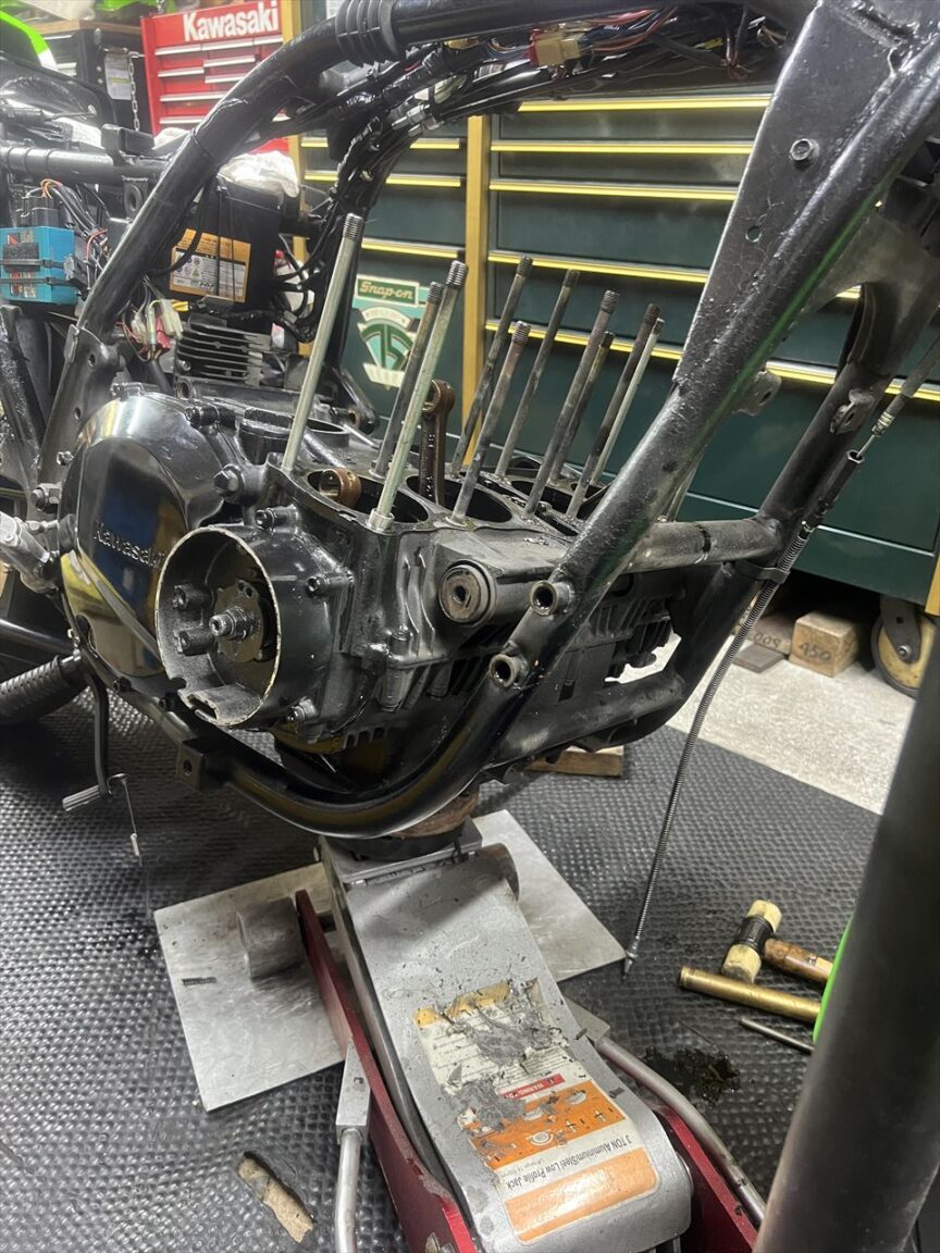 今回はエンジンオーバーホールとフレーム塗装が主な作業内容です。エンジン内部の仕様は車両入手時から不明とのことです。