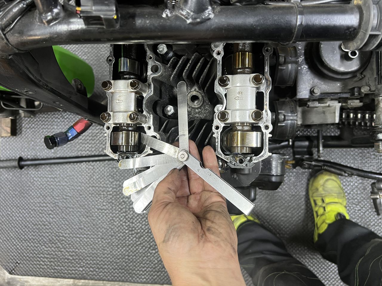 ヘッドカバーを外し、バルブクリアランスを計測します。カムはノーマルですね。