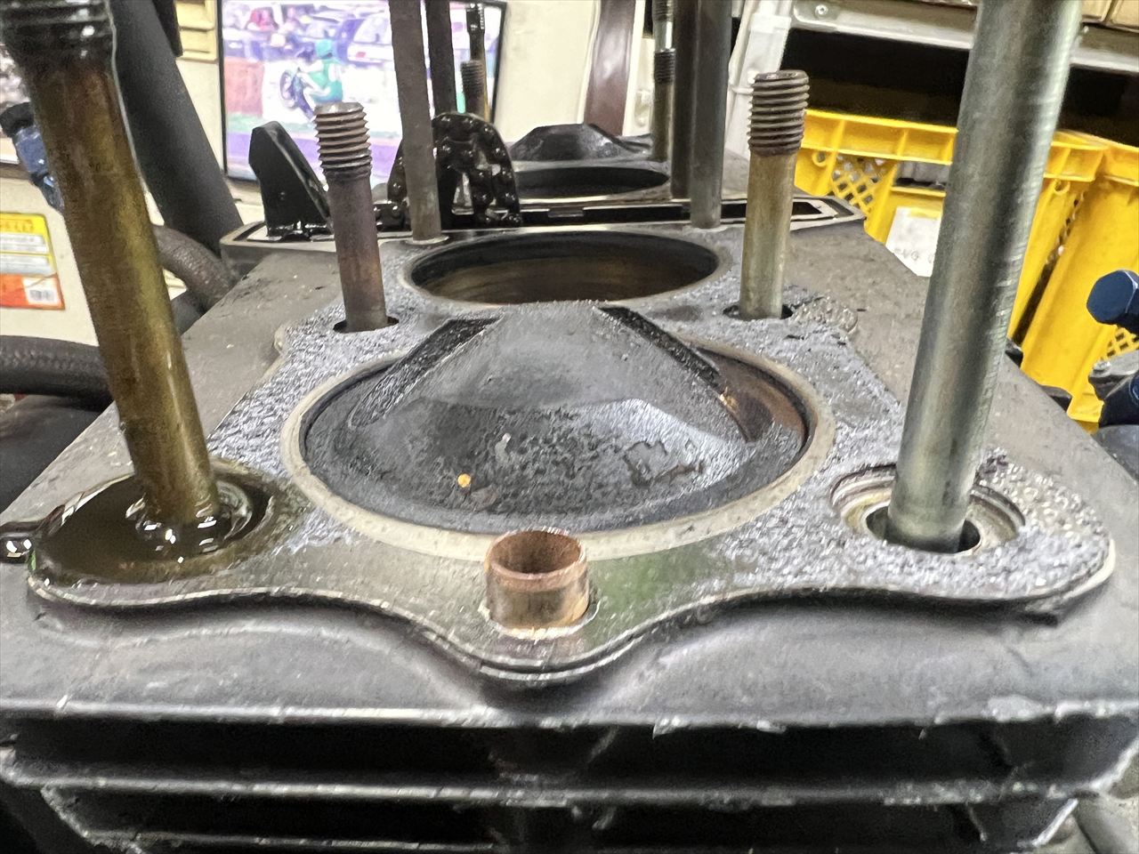 ヘッドを外します。なにやら尖ったピストンが見えてきました。