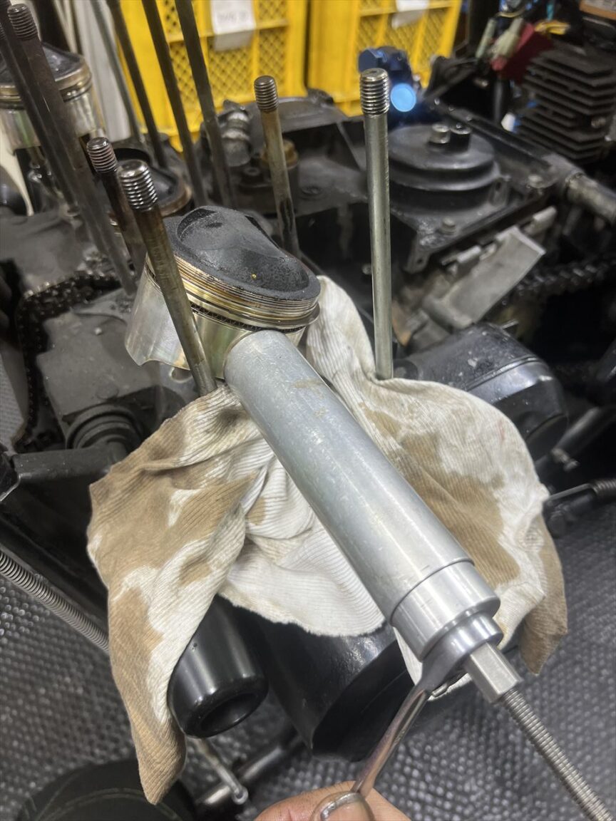 固いのでプーラーでピストンピンを外します。