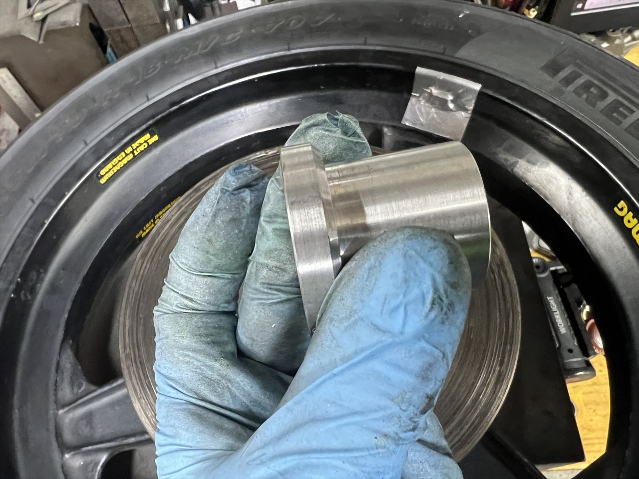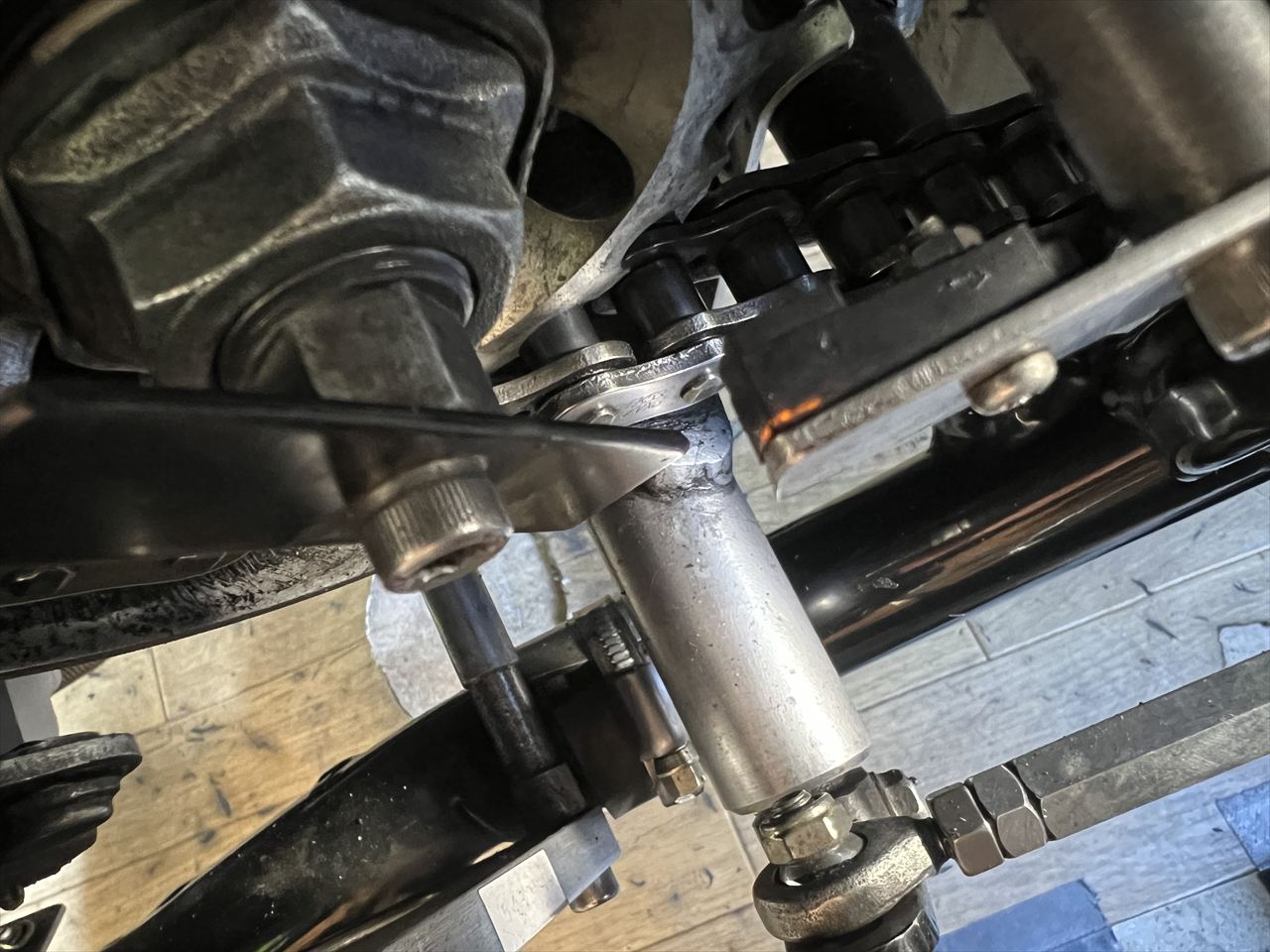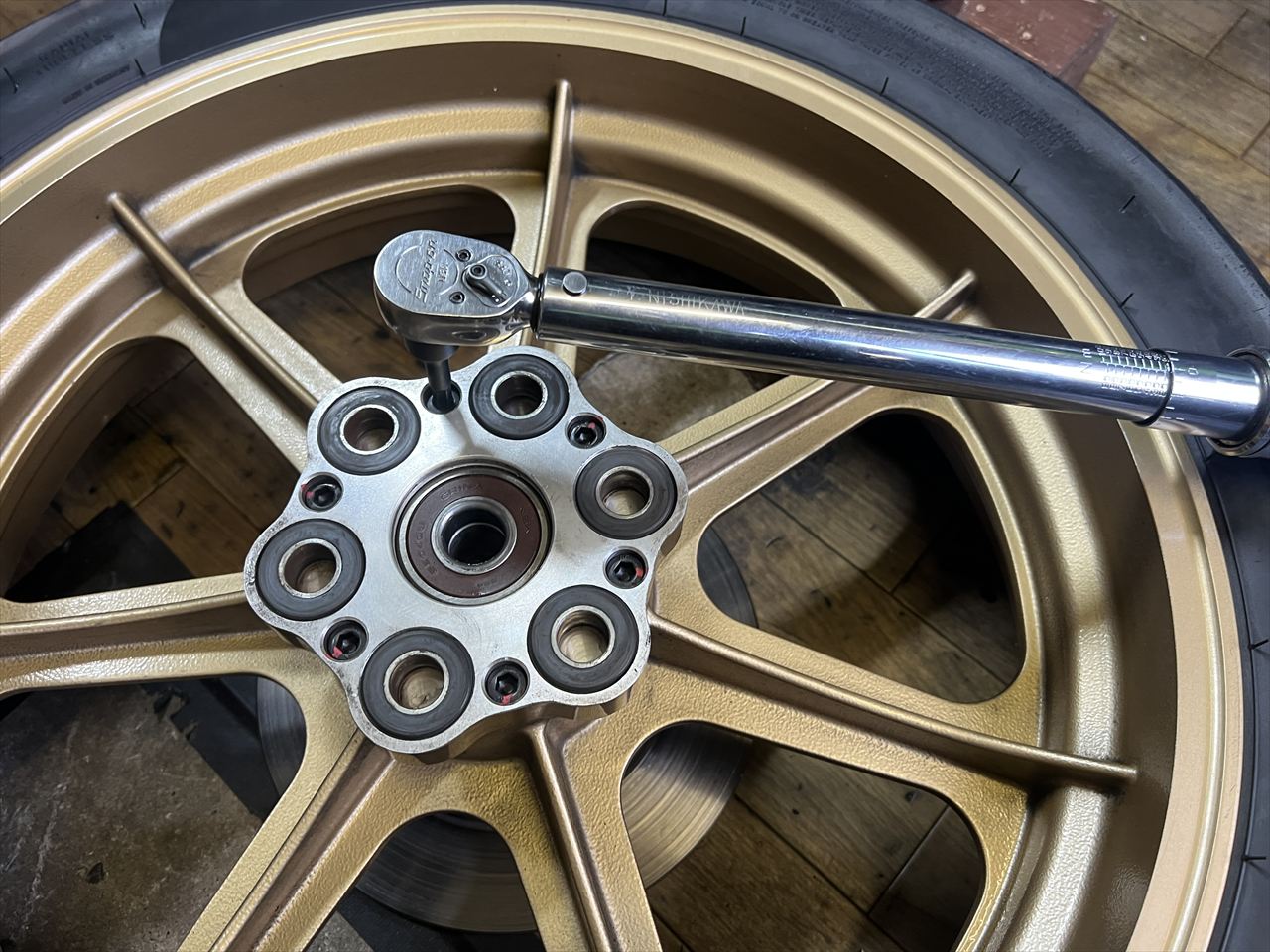 外したモーリスはハブ部のM8ボルトのトルクをチェックしておきます。ここのボルトは緩んだ例もあるので、ホイールを外した際は点検しておいた方がいいでしょう。ボルトが通常より細いので緩みやすいのかもしれません。