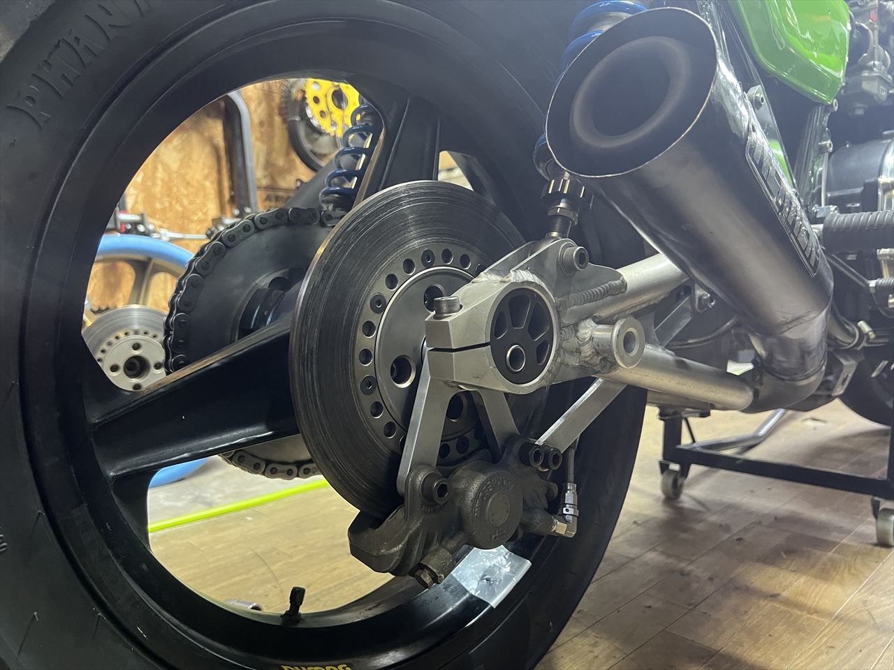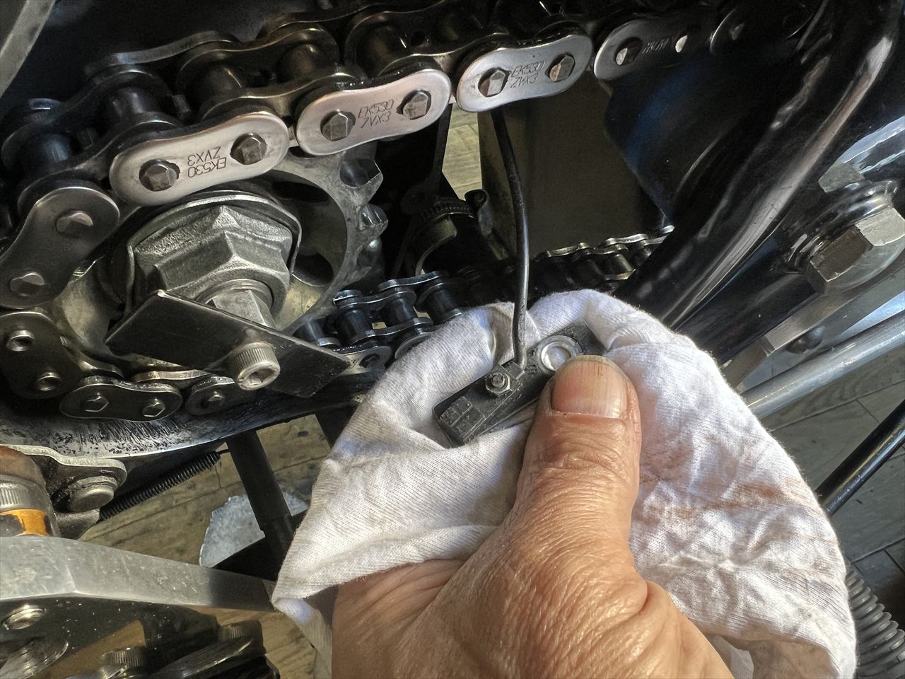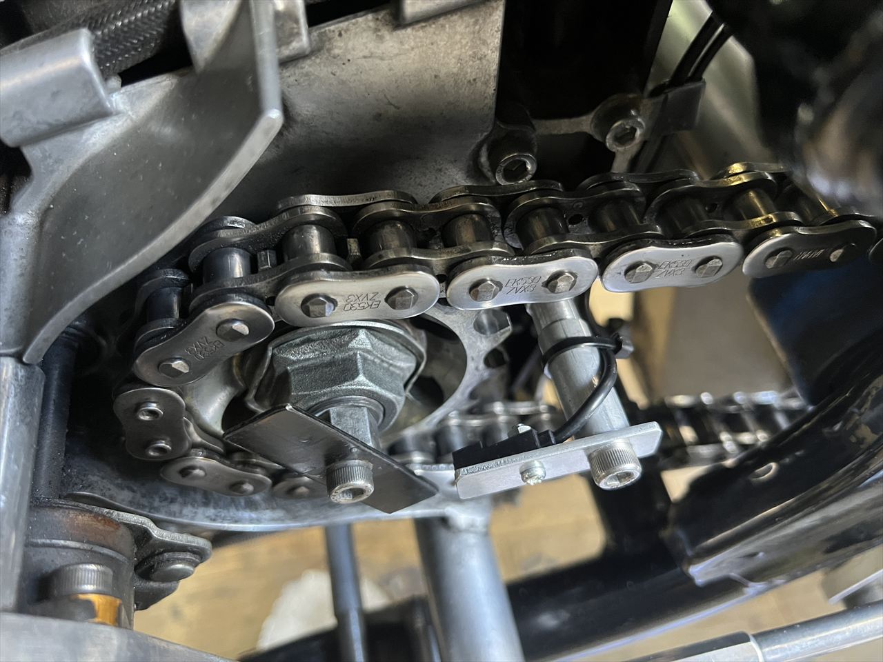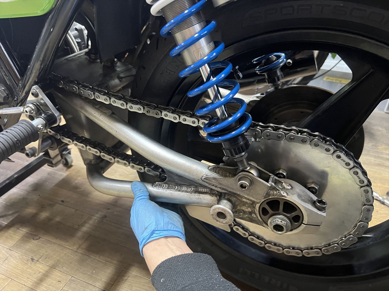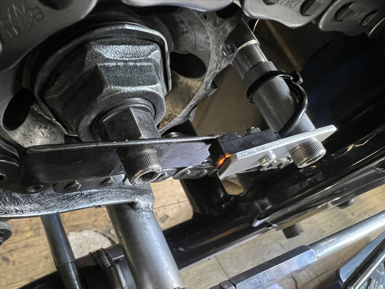 ホイール取り付け後、チェーンの弛みが多いので調整します。
