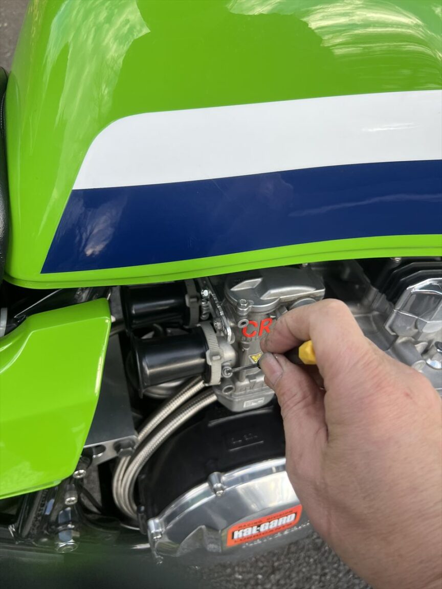 3000rpm以下でのエンジン不調の件は、CRキャブのエアスクリュー調整で直りました。具体的には戻し量を1と1/2から1と1/4に変更しました。夏冬での微調整は必要なので、冬場は少し濃いめに振ってみてください。厳密には日々の天気でも最適値は変わるので、ご自分で微調整できるようになるとより楽しめます。