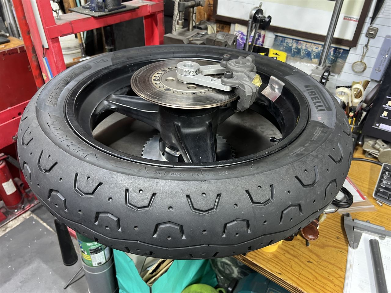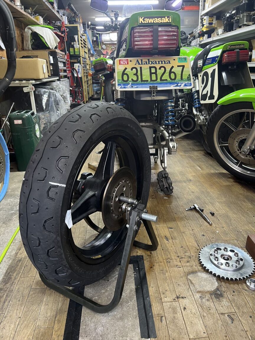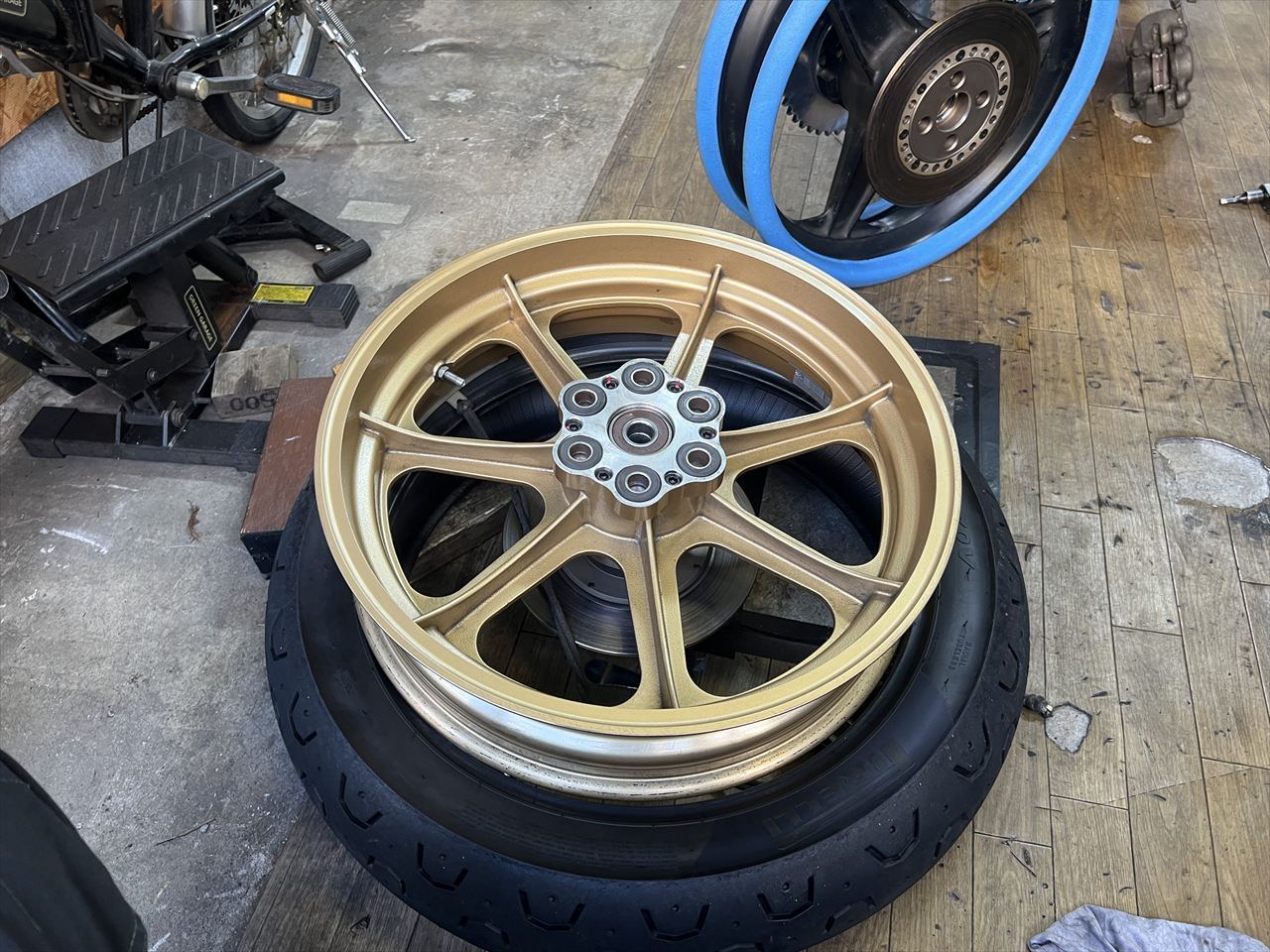 外したタイヤをダイマグに組んでバランス調整します。