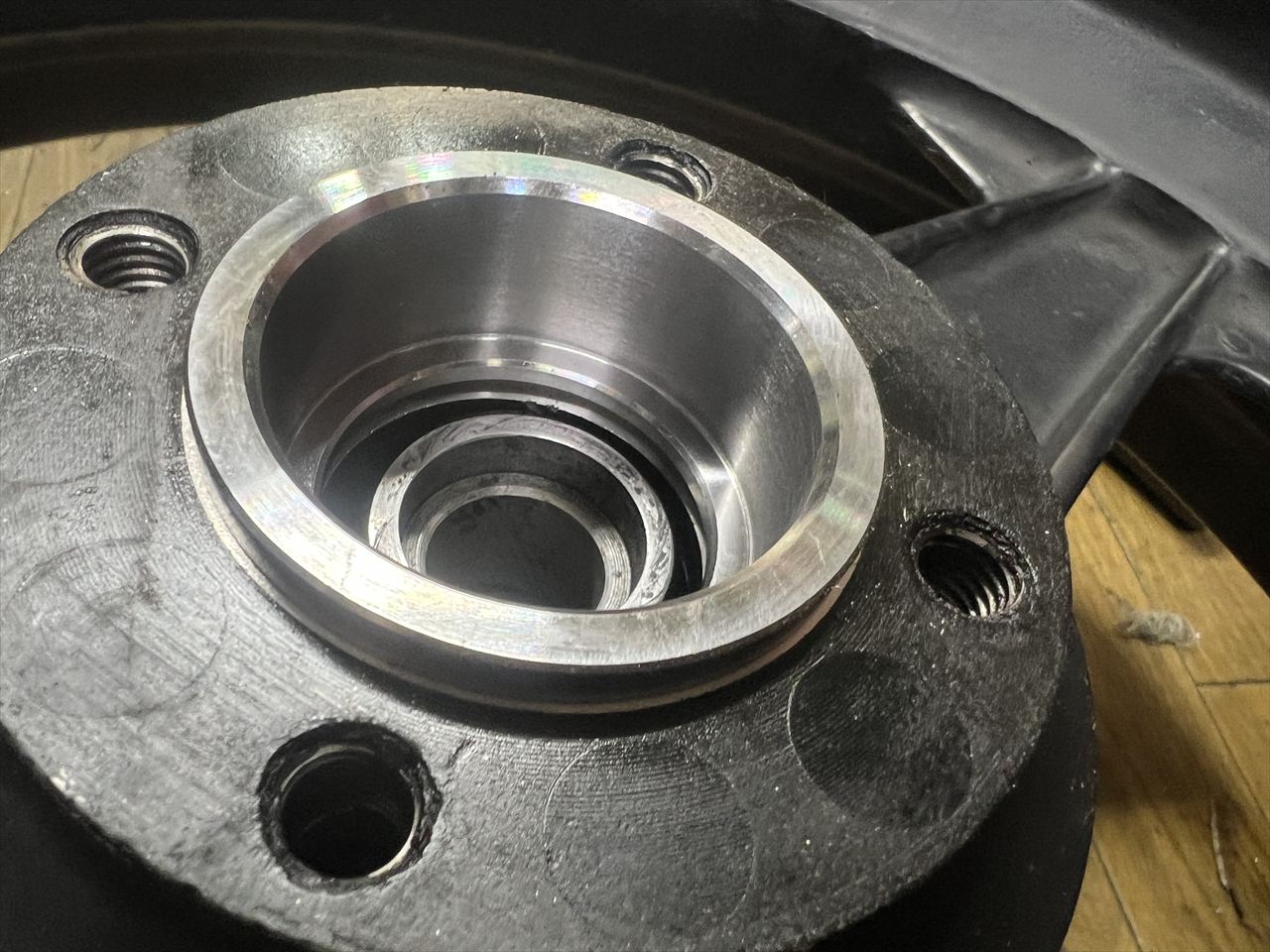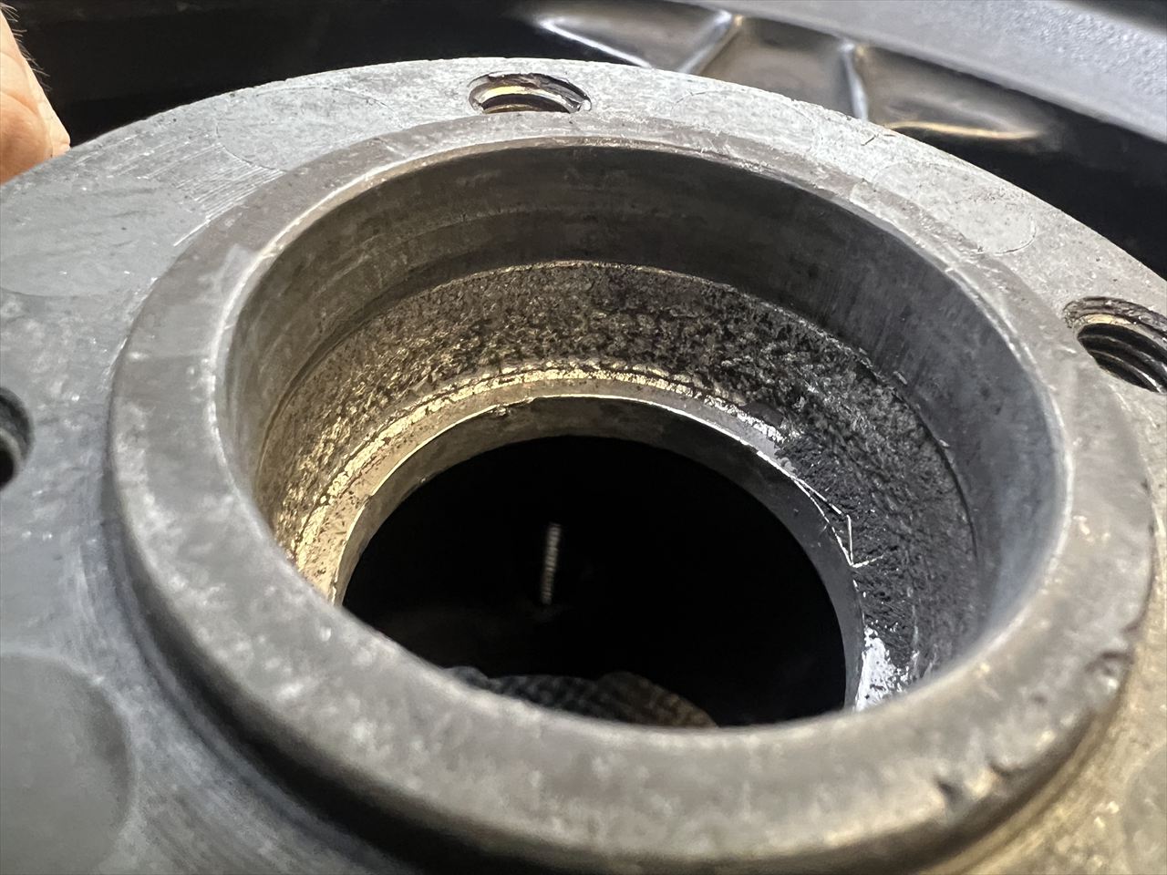 こちらは今回の修理後の様子。ベアリングハウジング部分を大きく削り取り、スチール製のカラーをはめ込んで元のベアリングサイズを復元します。カラーを圧入する際は、高温下での圧入代の低下を想定し、最大限圧入代をきつくできる「焼き嵌め」という方法で圧入しています。