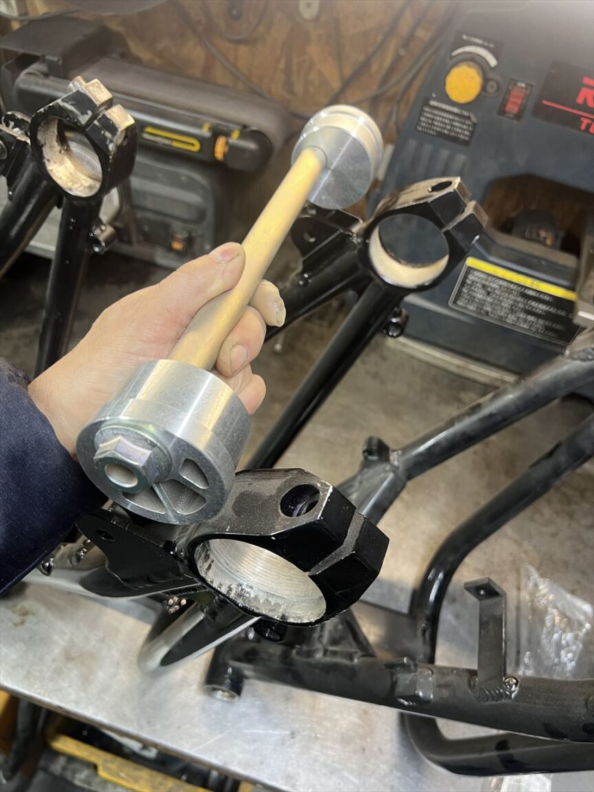 エキセントリックは弊社鋳造素材から作ったワンオフ品、アクスルシャフトはZZR400純正の中空タイプを使用。