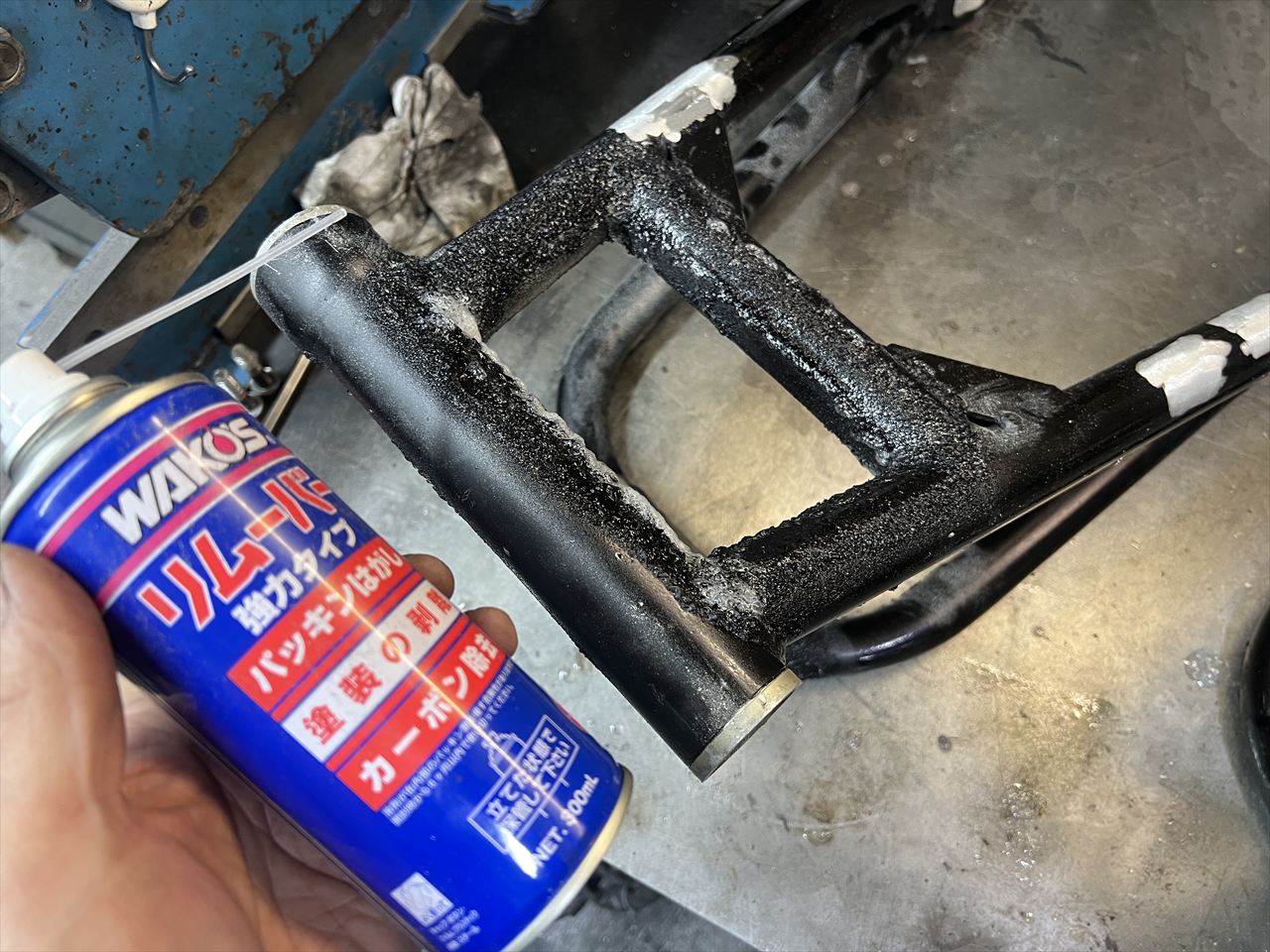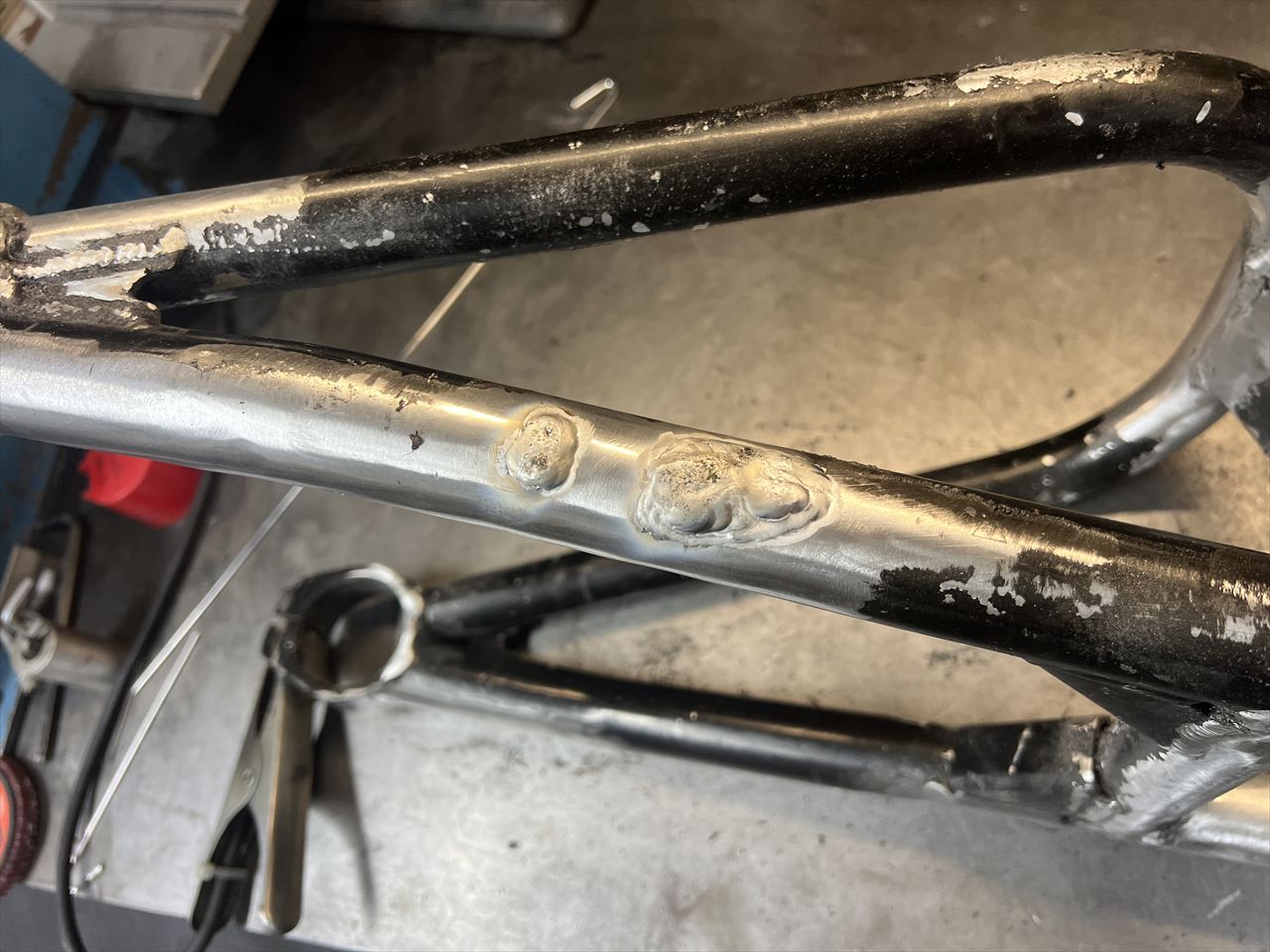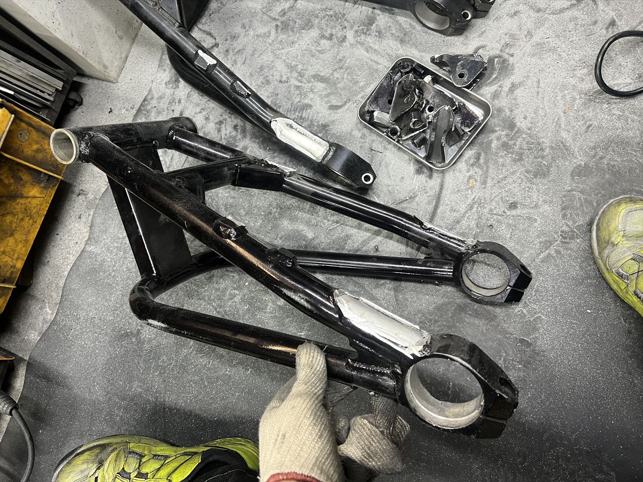 中古スイングアームなので、多少のキズはつきもの。溶接で補修しておきます。このあと滑らかに研磨します。