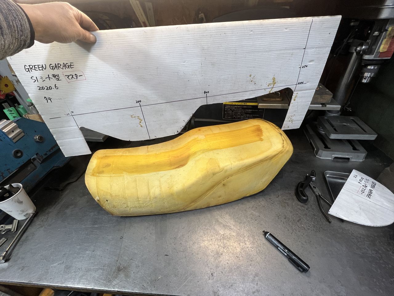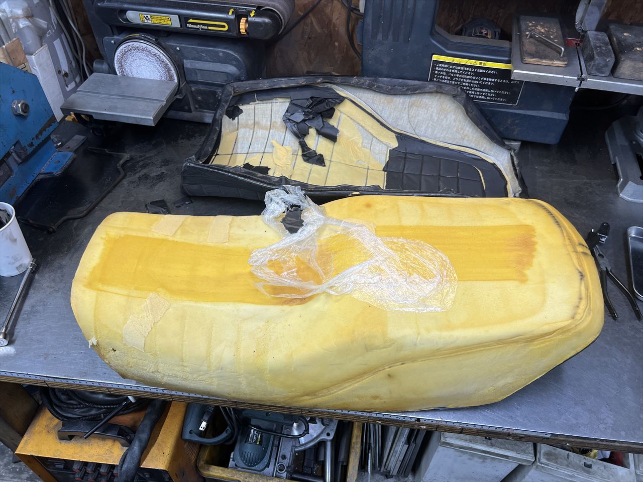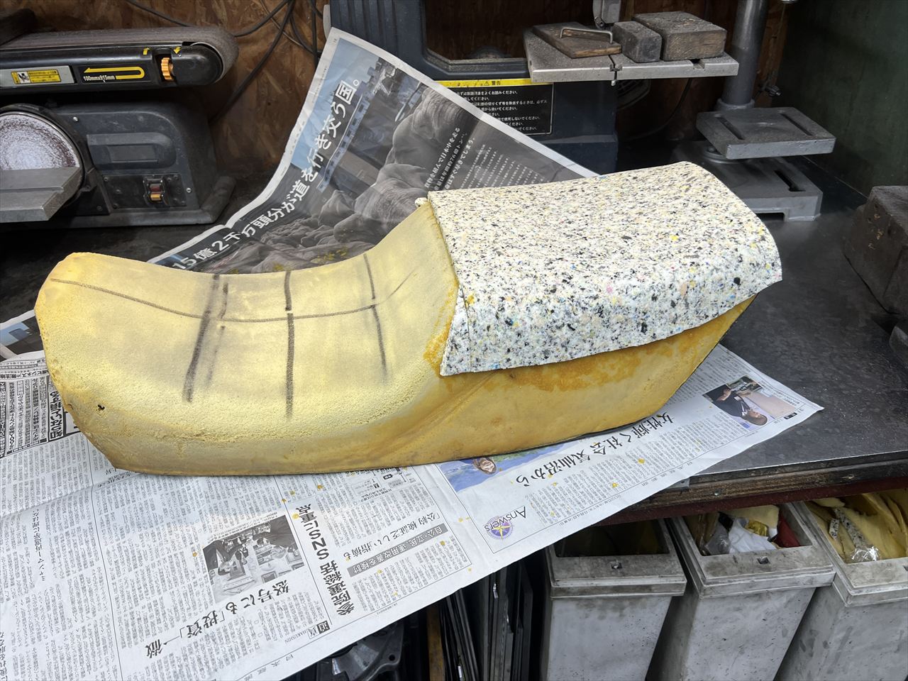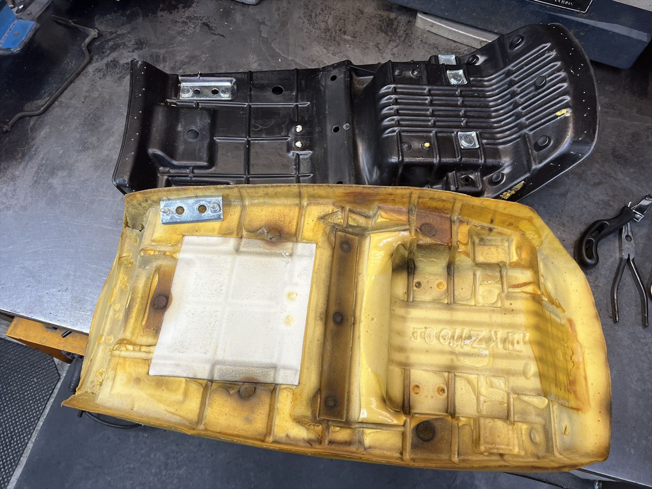 弊社で2種類あるS1シートの製作方法、今回はノーマルスポンジ加工のタイプのご依頼です。送っていただいたシートは未加工のZ1100GP純正シートのようです。
