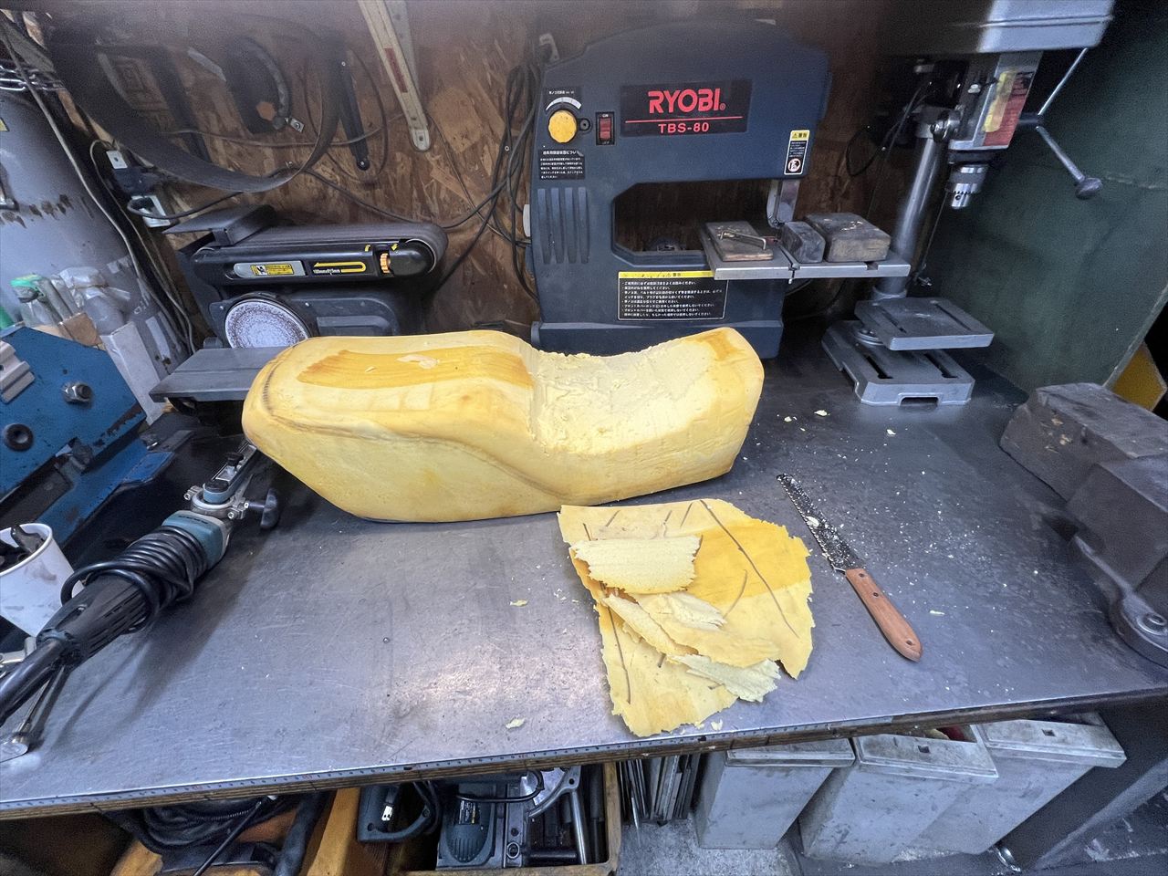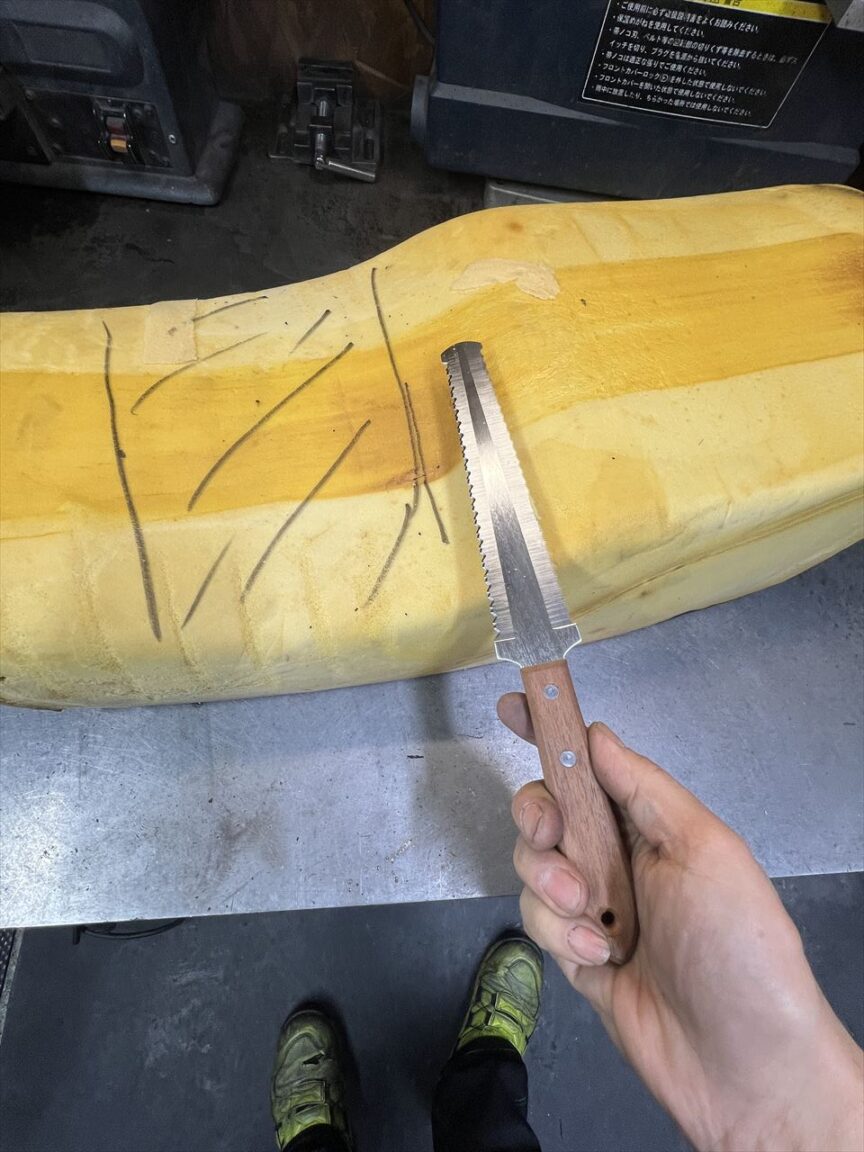 ライダー座面は大きく切り込むので、初めにパンナイフで大まかに切り取ります。