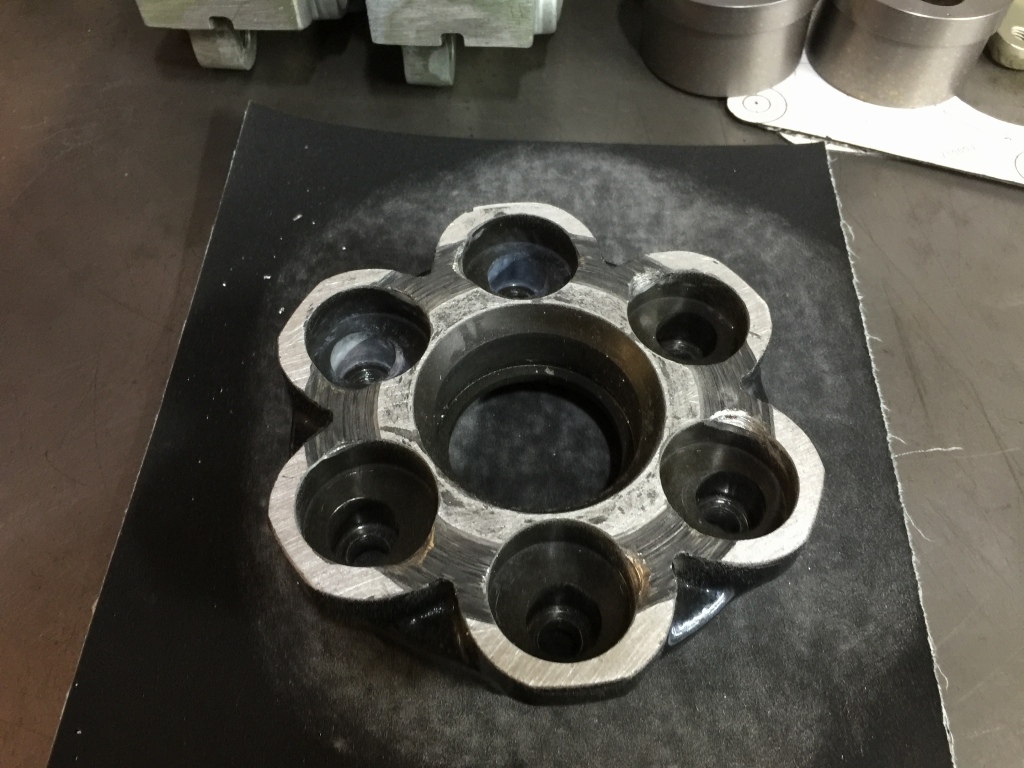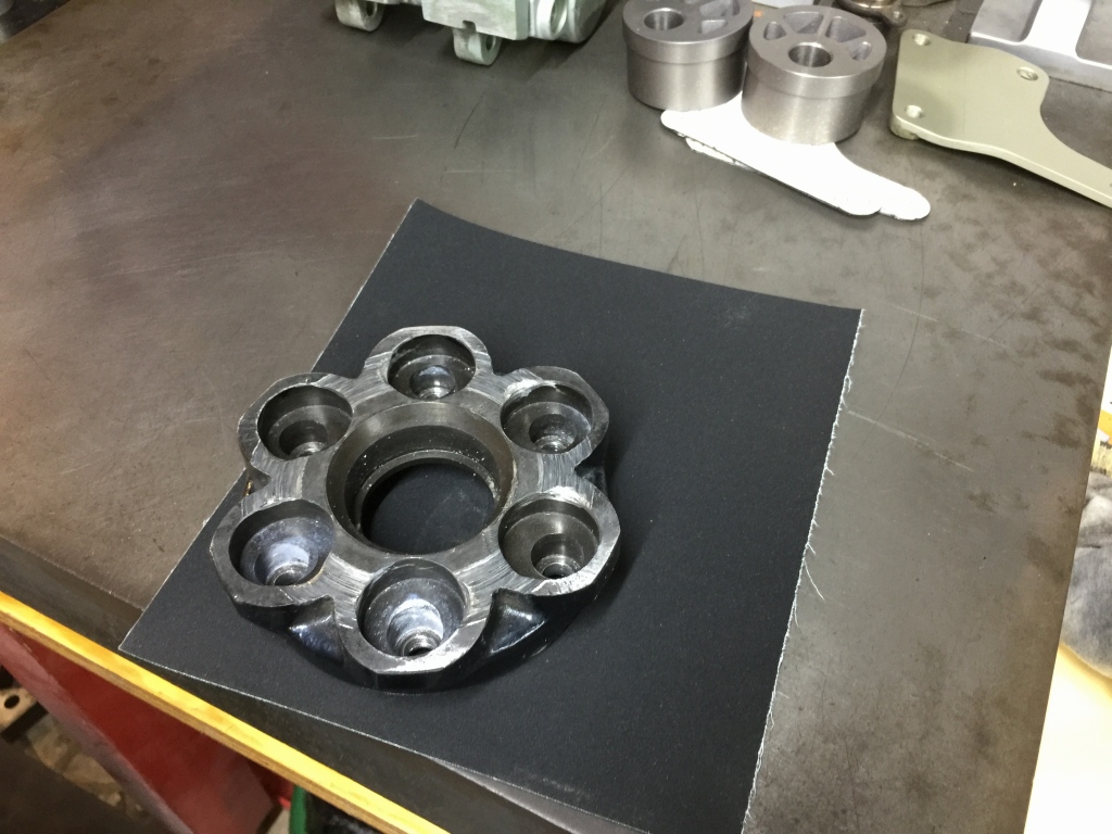 センターのディスタンスカラーは、ベアリングの接触面がオーバートルクで座屈しているので、定盤上のペーパーで面出しします。