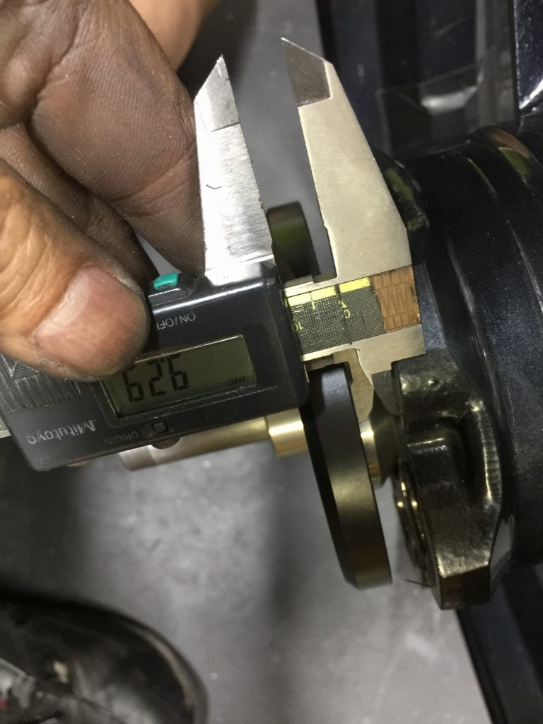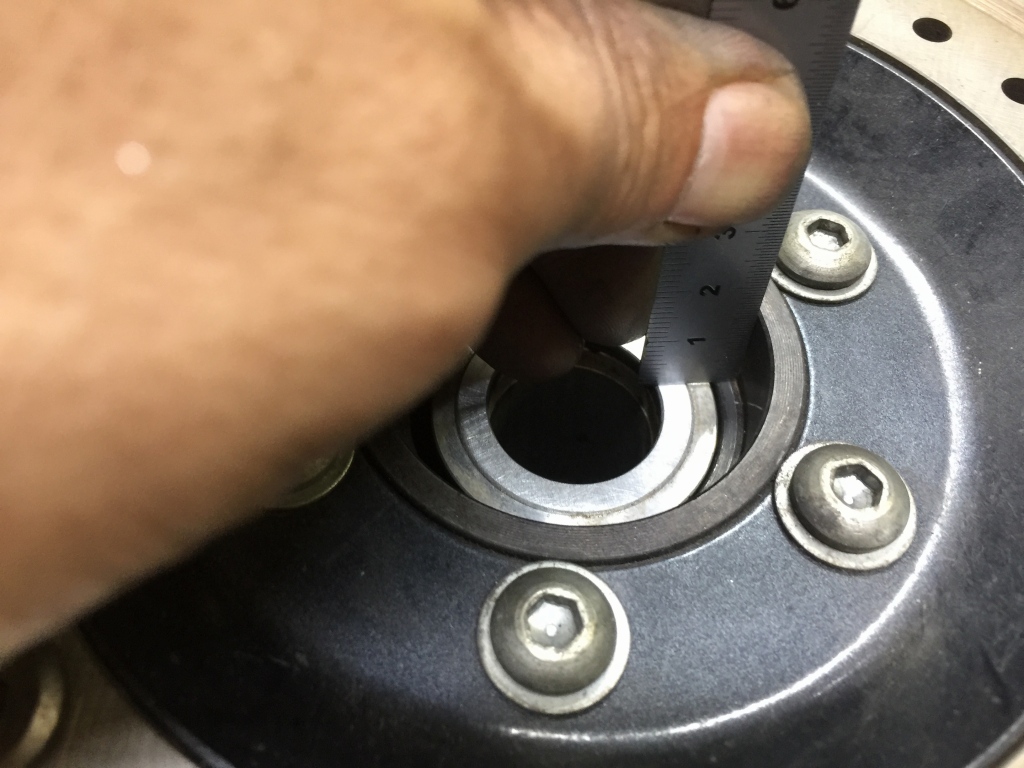 今回のキャリアは任意の寸法で製作しているので、この隙間は現状では9.3ミリです。使用するスプロケが8ミリ、シムが0.5ミリ、クリアランスを0.2ミリ確保するには、カラーをあと0.6ミリ削ることになります。