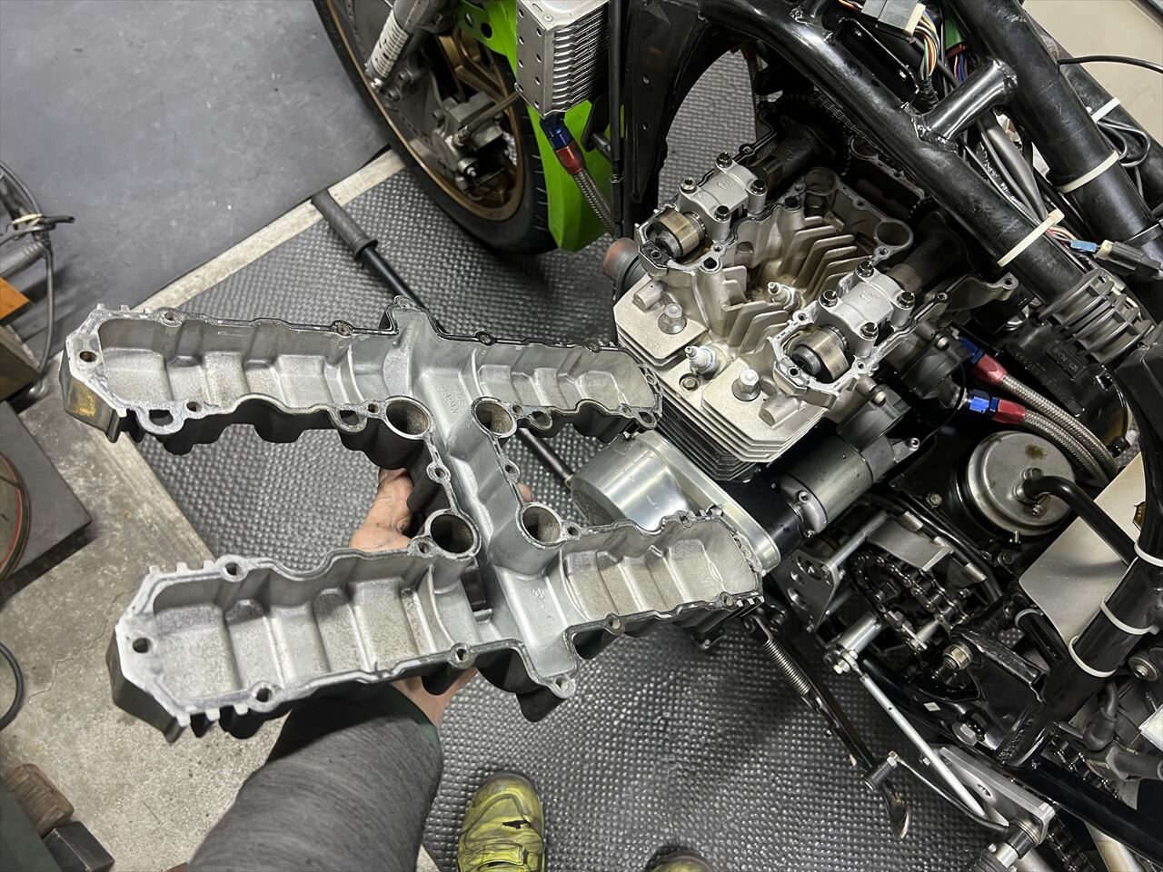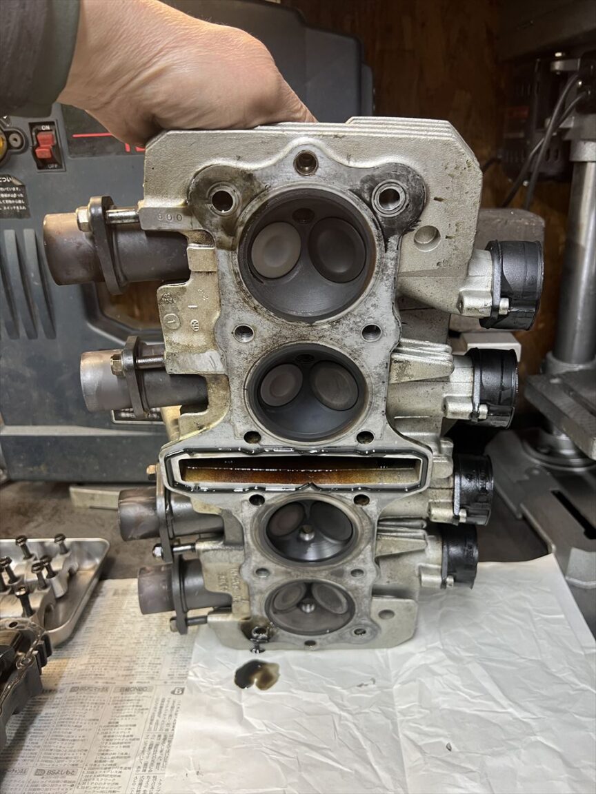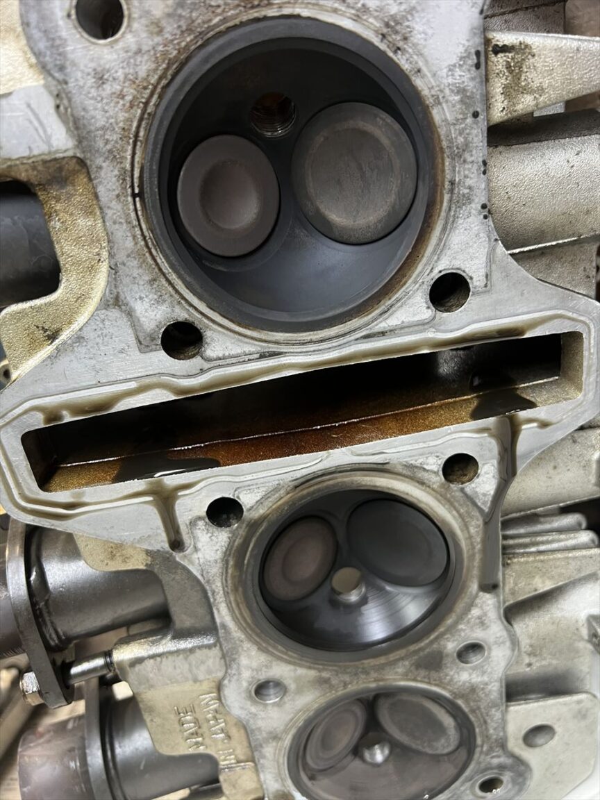 燃焼室はこんな感じ。1年の内ほとんどがサーキット走行なので、カーボンの堆積は極僅かです。カムチェーントンネルのOリングが1ヶ所切れていますね。