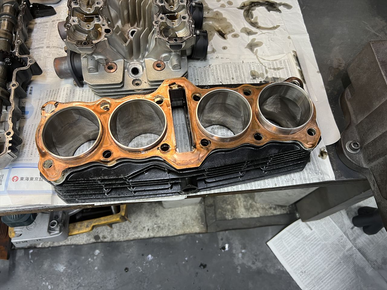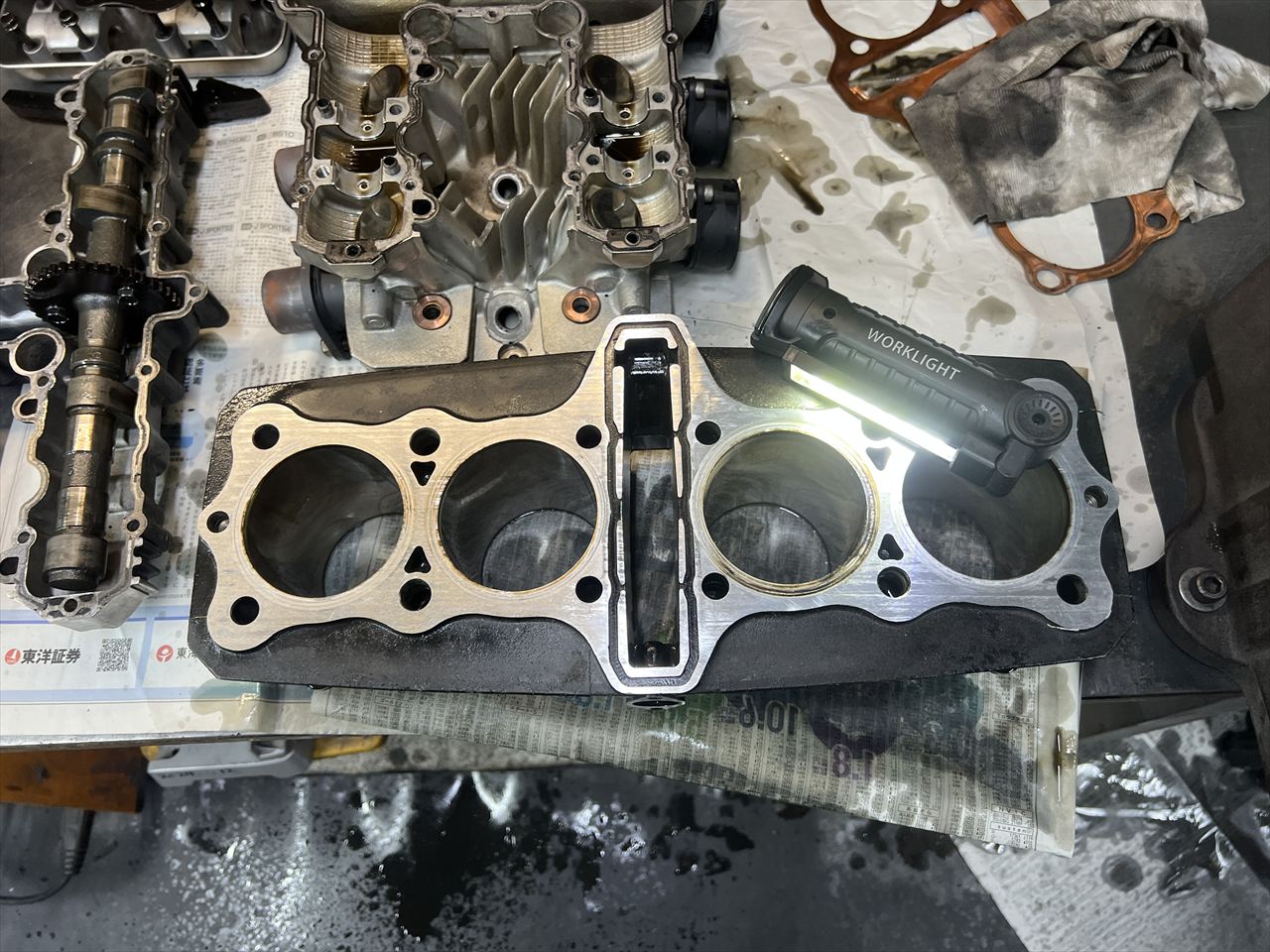 ヘッドガスケットを見ると、原形をとどめています。このエンジンはボア76ミリの1200ccですが、ボアが大きいと2番3番のカムチェーントンネル側のヘッドガスケットがごくごく細くなり、場合によってはガスケットが負けてそこからガスケット抜けが発生することもあるのですが、どうやら今回ガスケットは耐えていたようです。