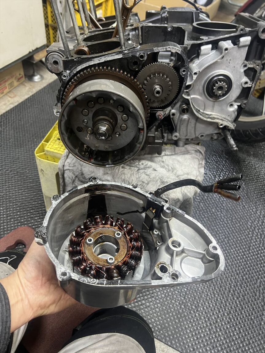 ジェネレーターカバーを外します。ステーターコイルの色は濃い目ですが、割と整っているようです。