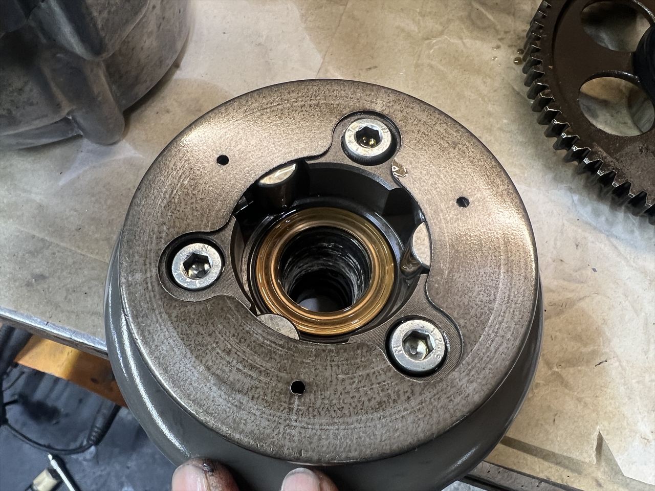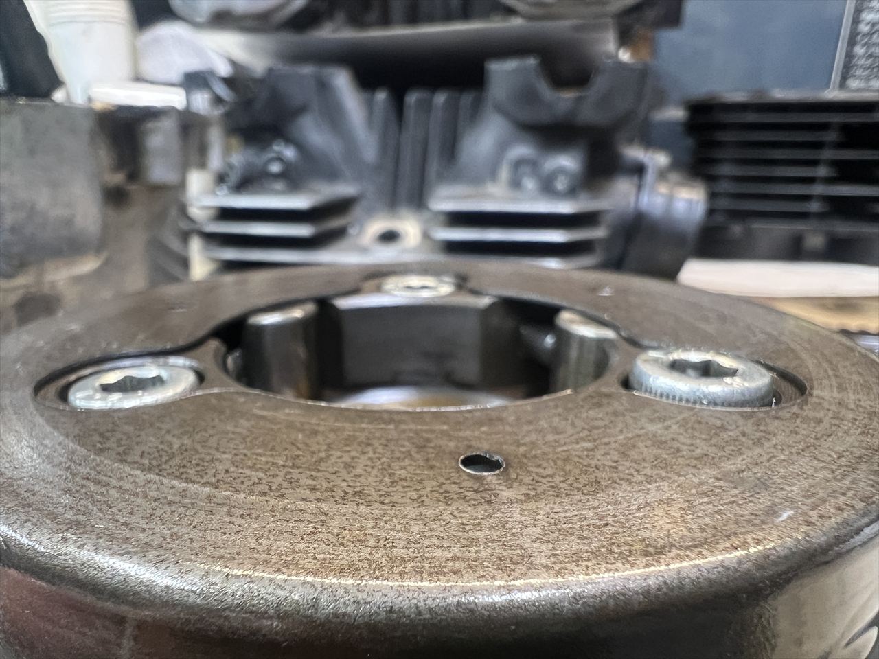 ジェネレーター側を見てみると、ワンウェイクラッチのボルトは緩んで頭が出てきています。