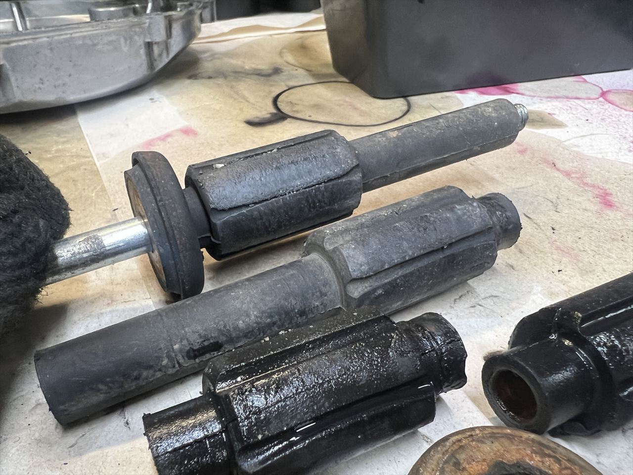外したダンパーがこちら。硬化して摩耗しており、エンジンが少し後ろに寄っていた状態になっていました。