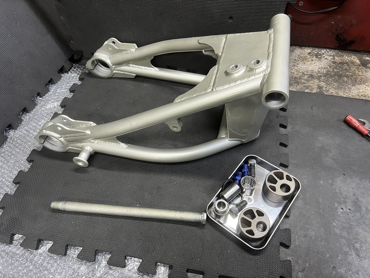 レプリカS1スイングアームのレストアも最終段階です。シャシテックさんでの塗装が終わったので、ベアリングなど部品を組み付けます。