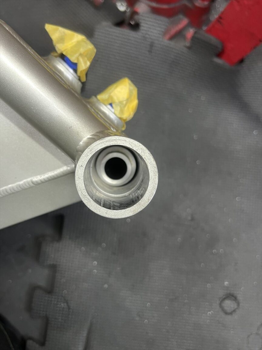 左側のベアリングを圧入後、加工したディスタンスカラーをセットします。