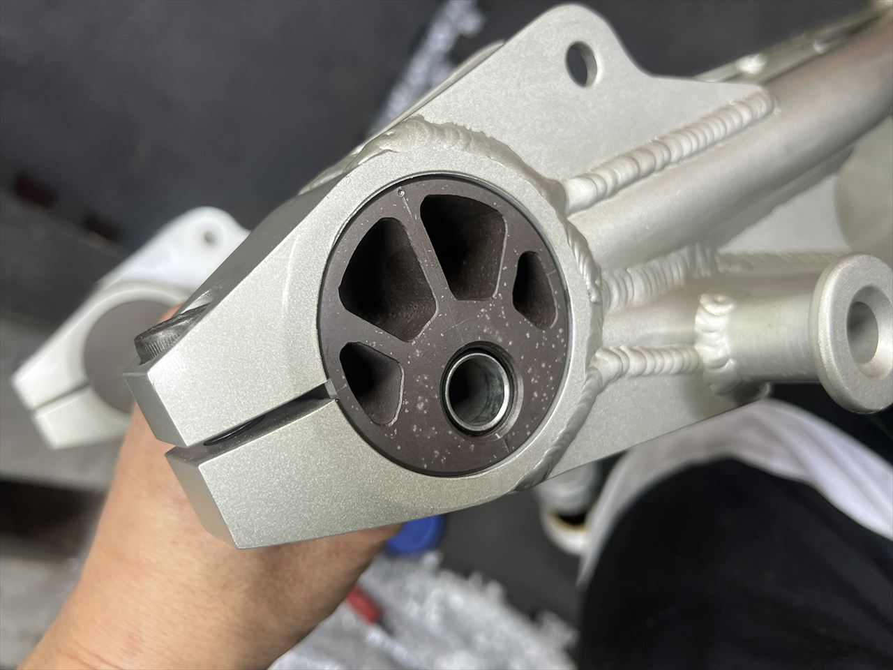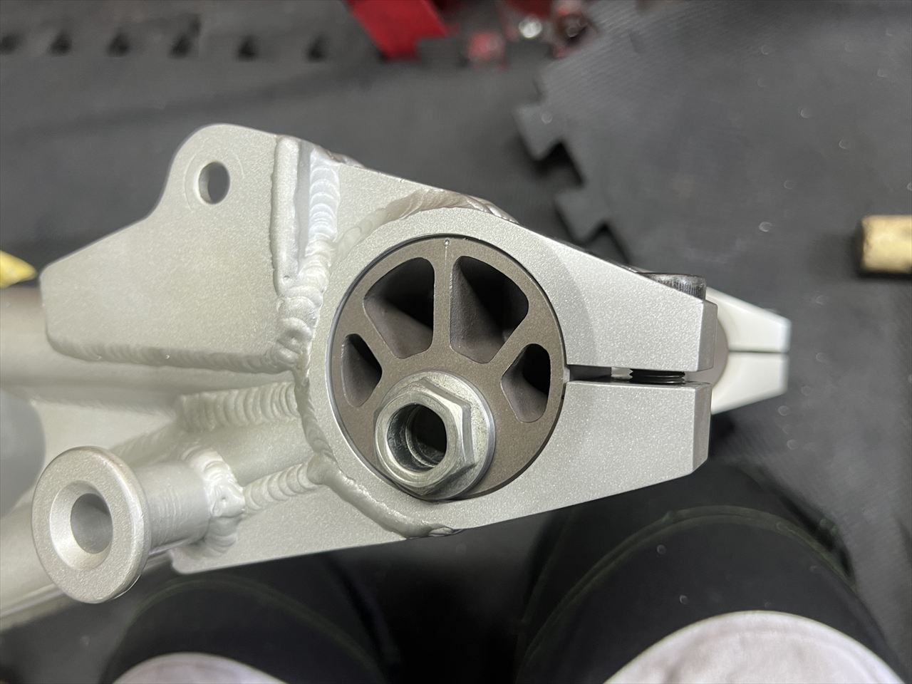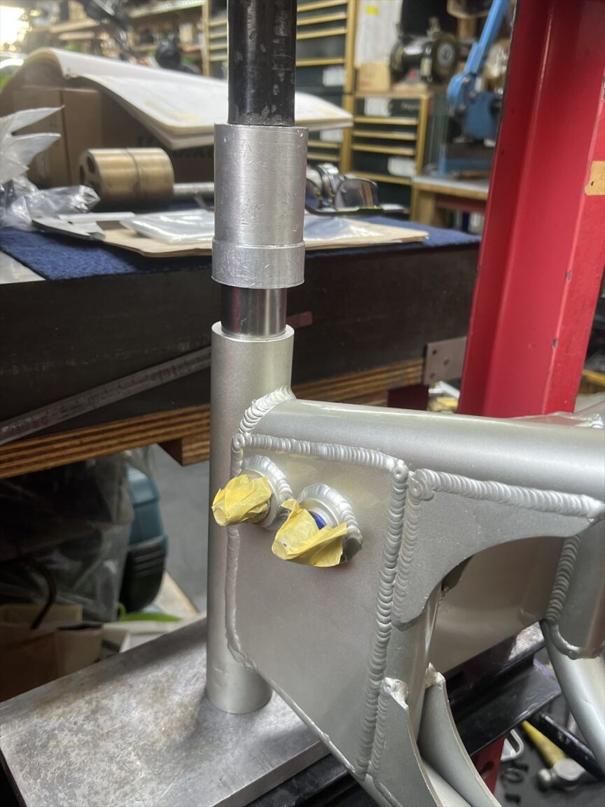 右が今回のS1スイングアーム。左はS1フルコピー品のスイングアーム。それぞれピボット部の外径は異なるので、現物合わせで製作します。