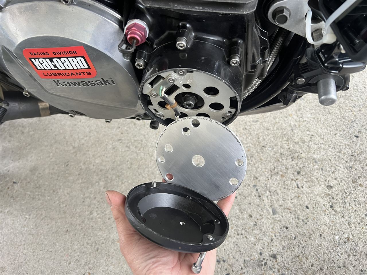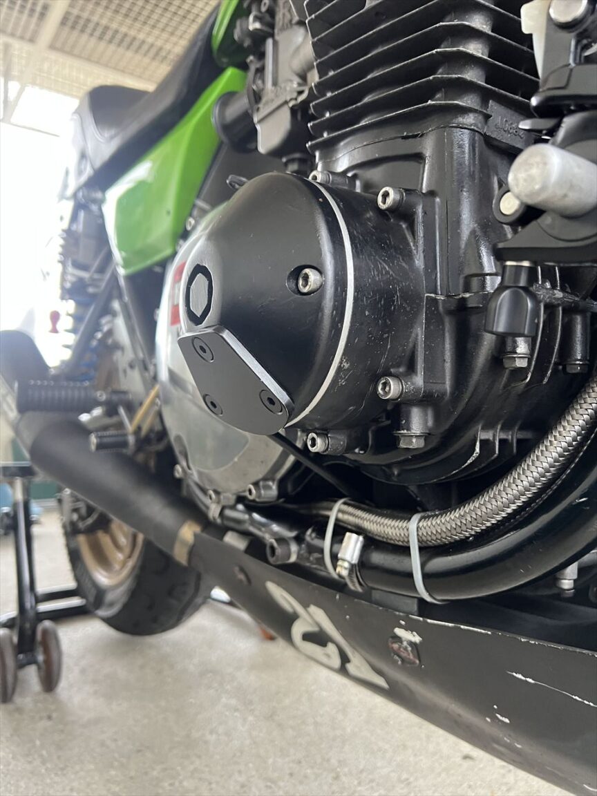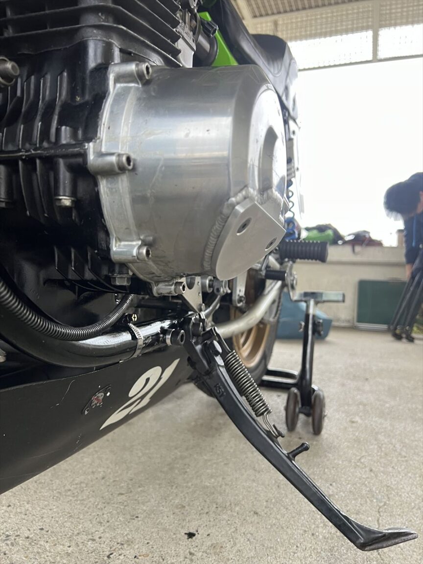 今回新しく作ったスライダーパネルタイプのエンジンケース保護カバーもサーキット側に見せ、基準適合の判断をもらいました。