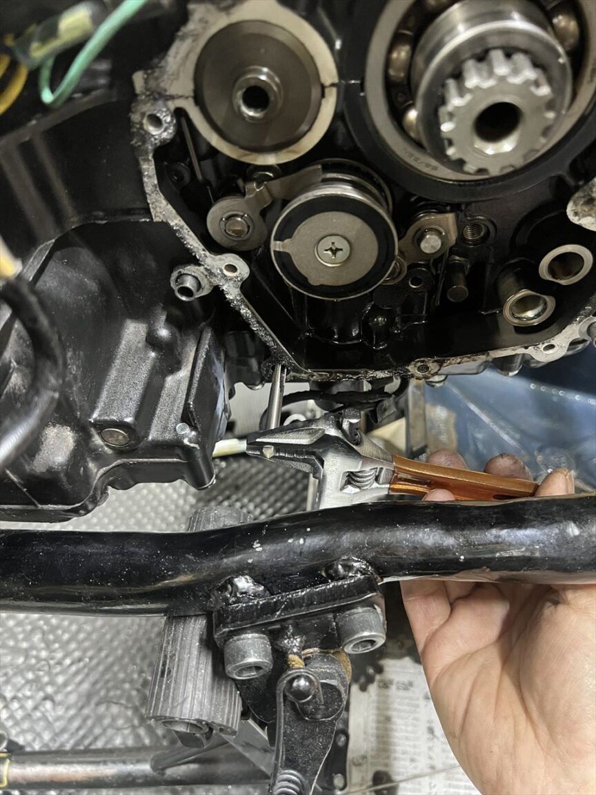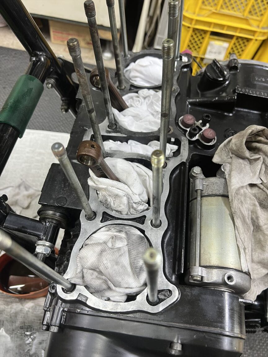 ケース側のシリンダーベースのガスケットを剥がします。ガスケットそのものはシリンダー側に付いていますが、剥がれた残りがなかなかしぶとくて剥がすのに難儀します。