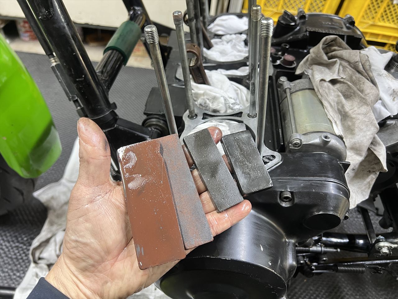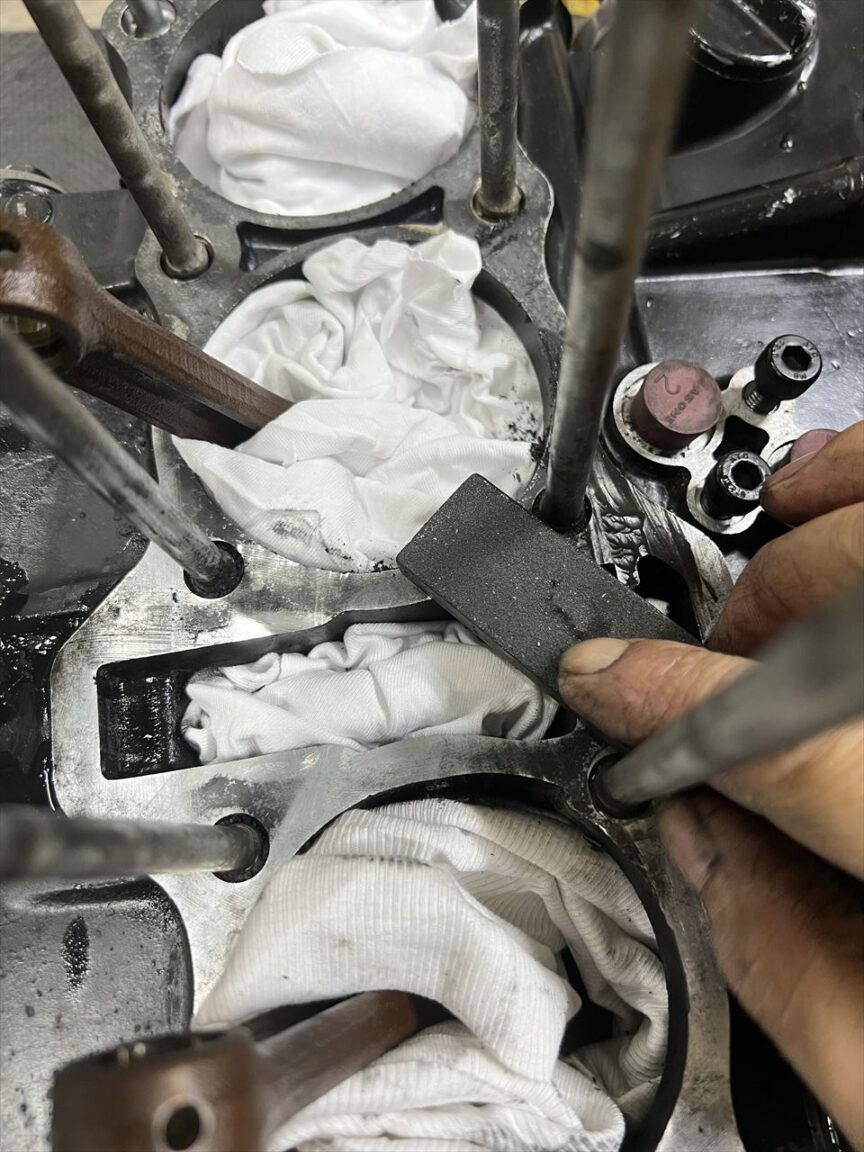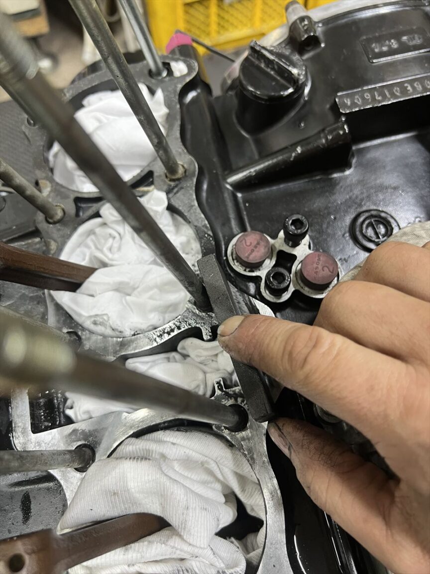 ガスケットを大方剥がしたら、オイルストーンでカスを取り除きます。このような狭い所では、小型のオイルストーン数種類を駆使します。