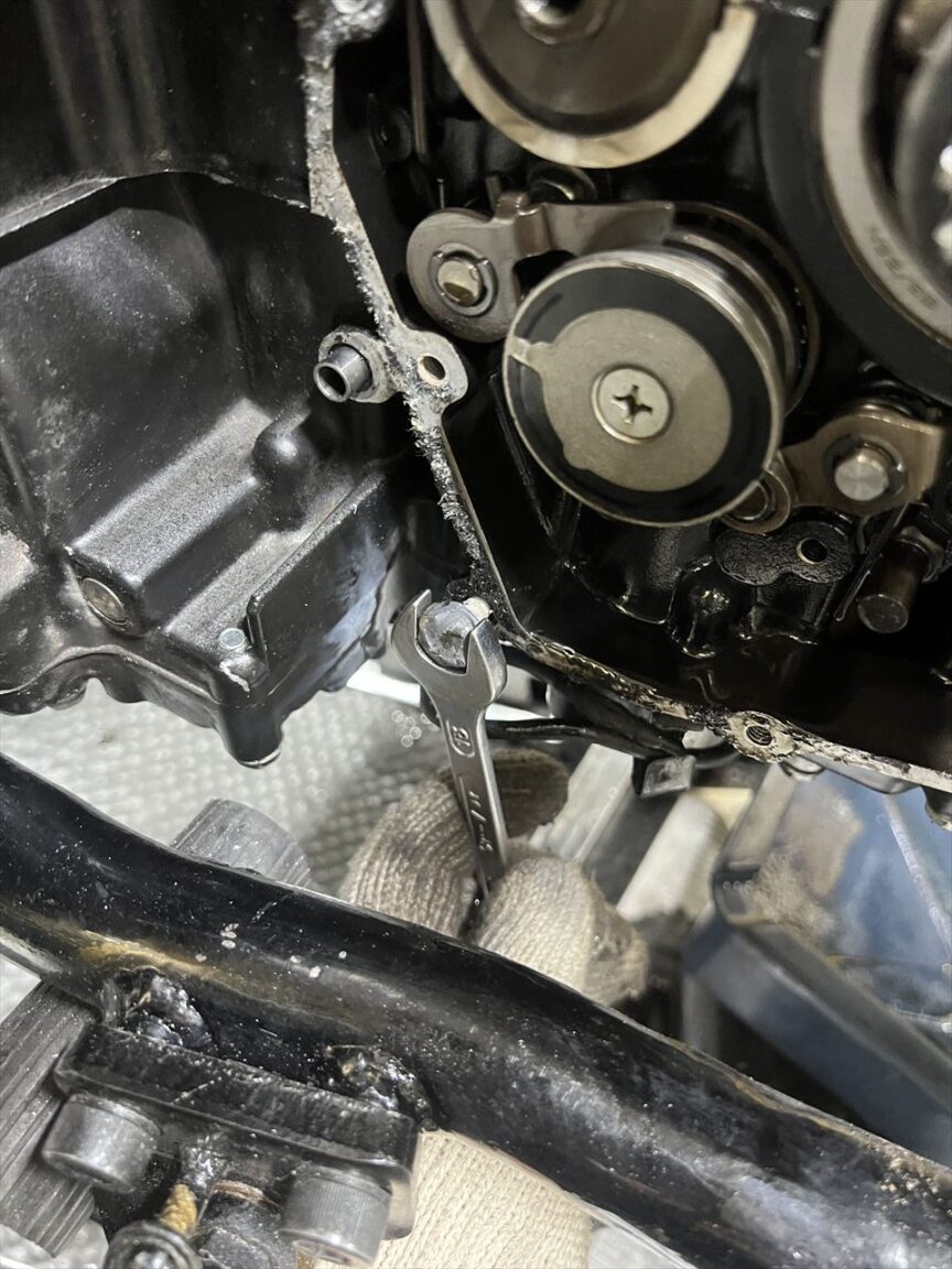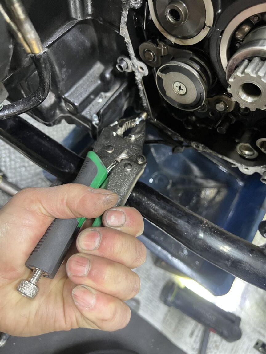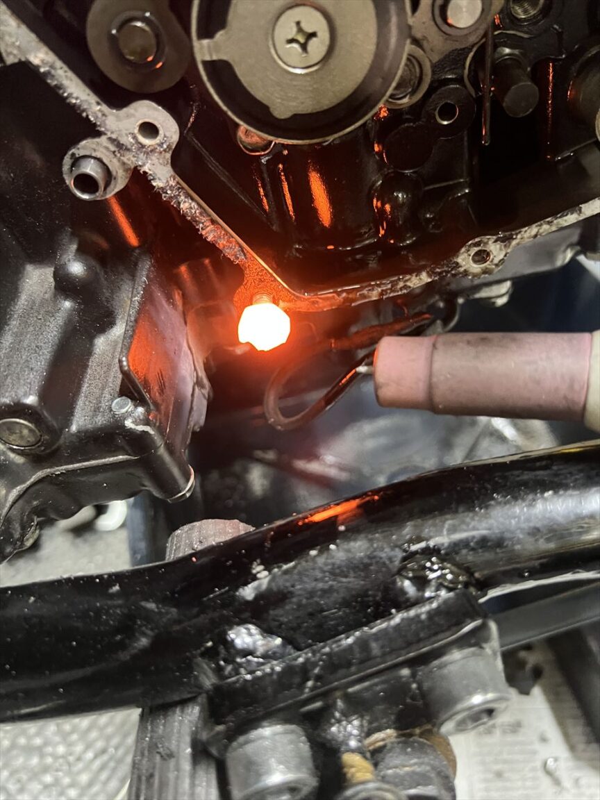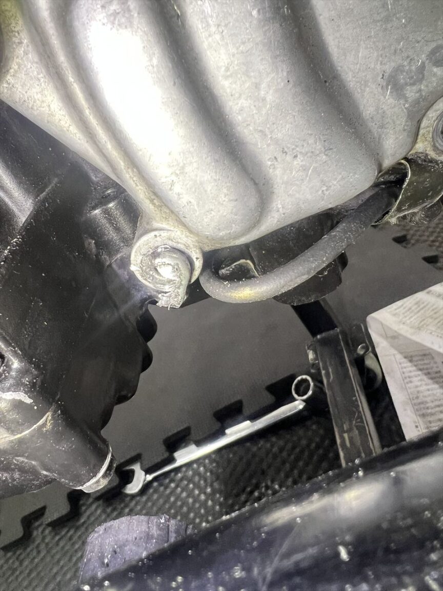 根元から折れたりすると、ドリルで揉んで取り出すことになりますが、この位置だとフレームが邪魔してドリルが使えません。最悪エンジンを下ろして作業することになります。