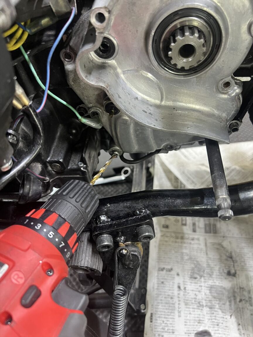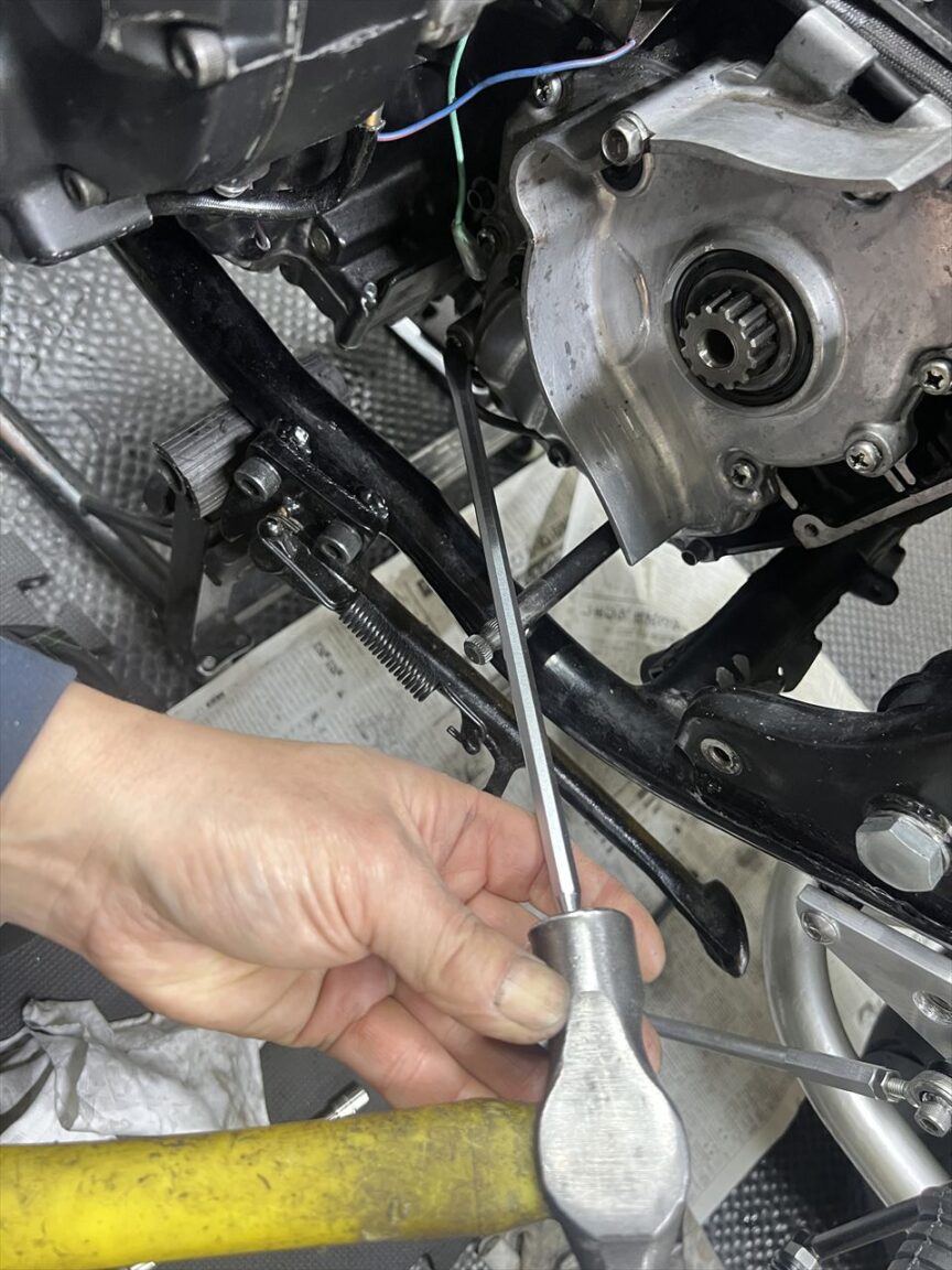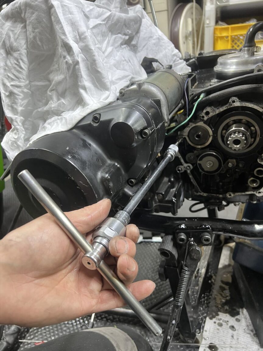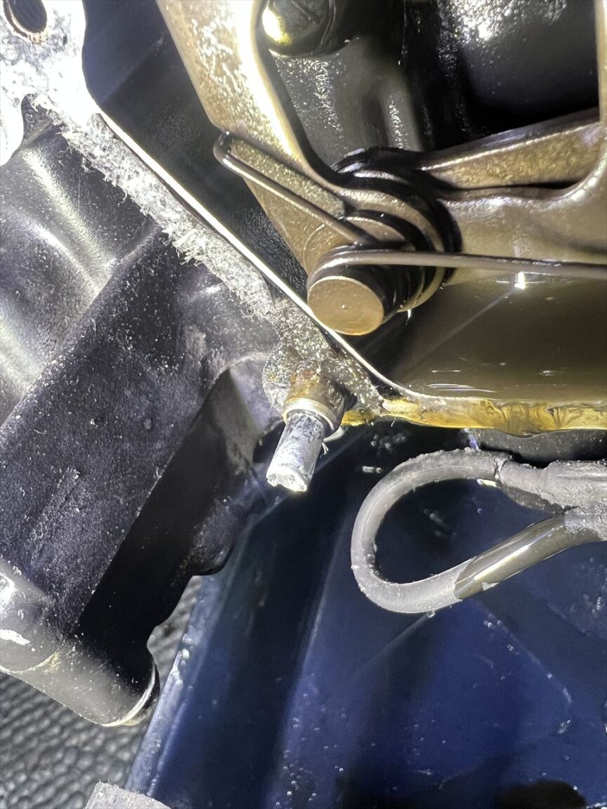 根元から折れたりすると、ドリルで揉んで取り出すことになりますが、この位置だとフレームが邪魔してドリルが使えません。最悪エンジンを下ろして作業することになります。