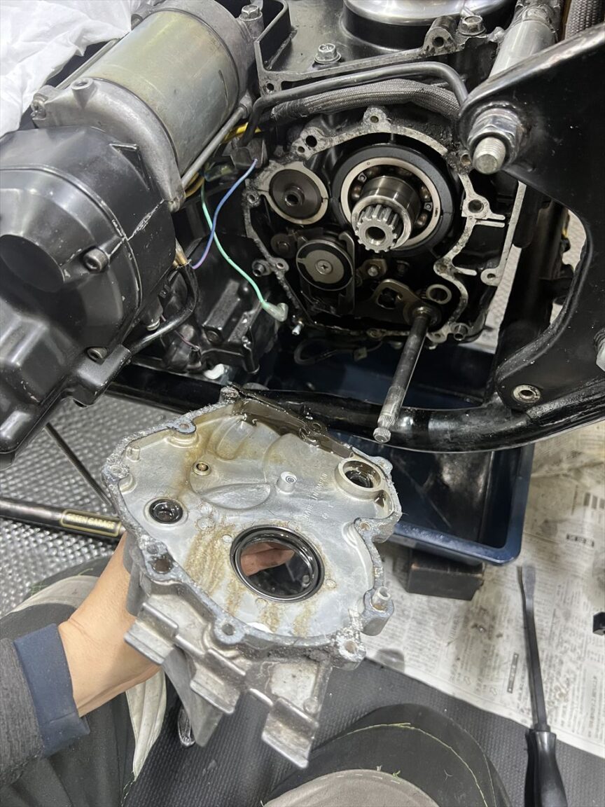 アウトプットシャフトのオイルシールからオイル漏れするので、ミッションカバーを外してオイルシール3個をまとめて交換します。プラスネジのボルトは新しいので更新してあるようです。