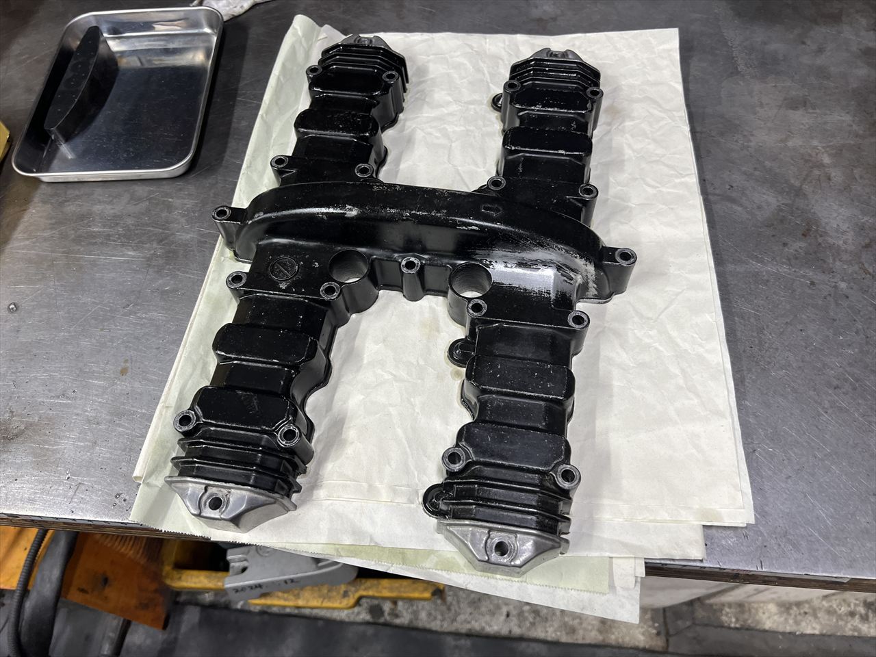 ヘッドカバーですが、初めは塗装の剥がしてあるところに液体ガスケットが塗られていました。クラックからのオイル滲みがあるのかとチェックしましたが、目立つクラックは発見できませんでした。