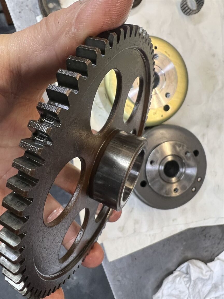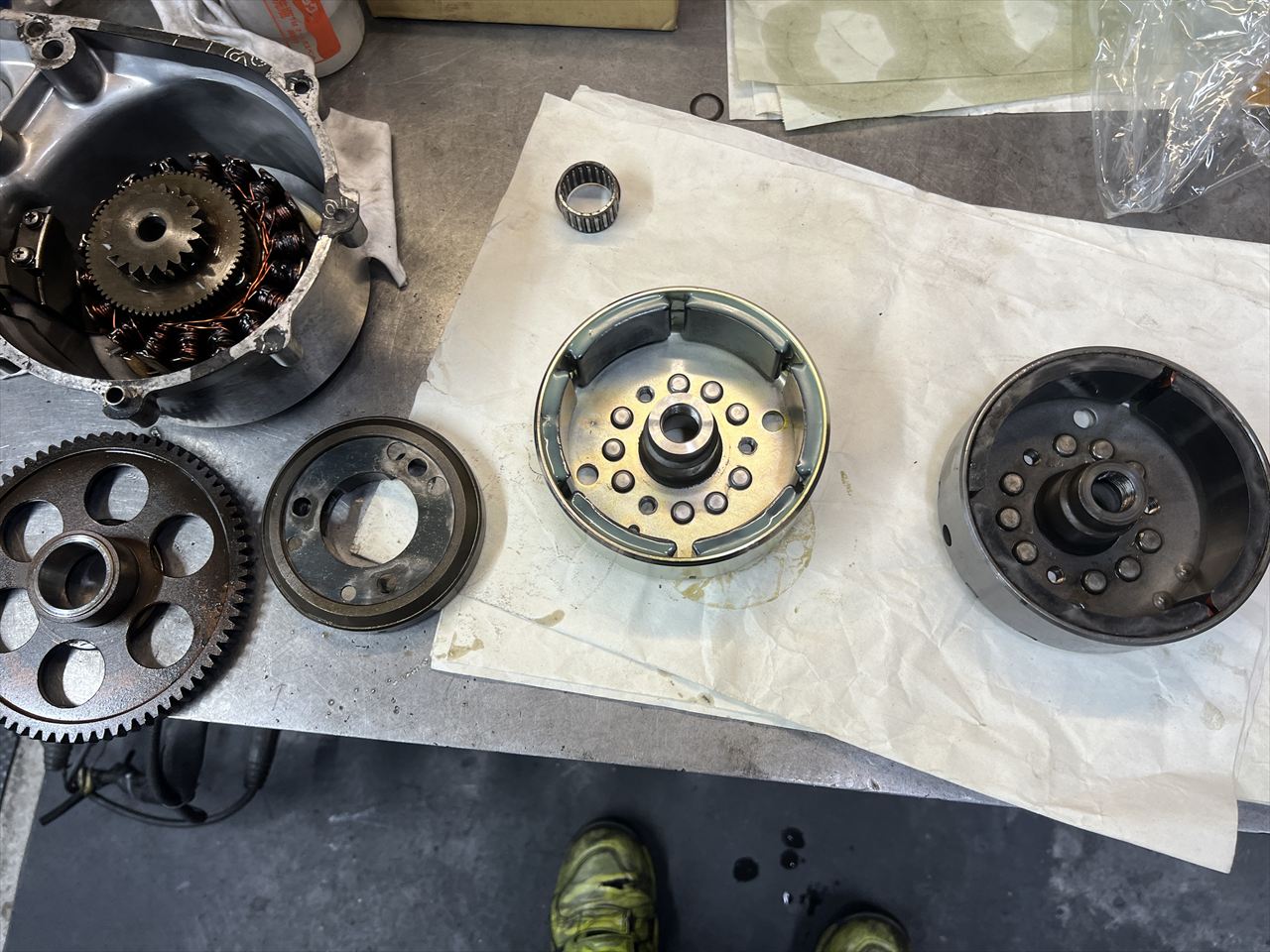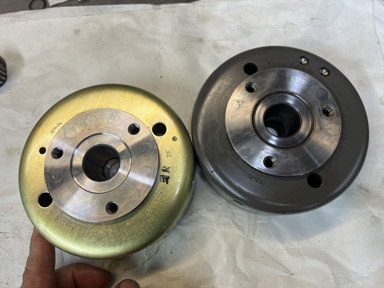 クランク側のキズの修正は困難ですが、キズは比較的軽微だったのでジェネレーターローター側だけ新品交換します。左がデッドストックの純正新品です。